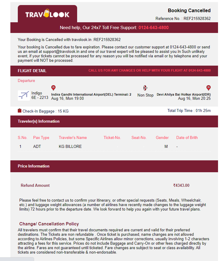 I had my booking of air ticket with Travolook on 13th August’21 which was cancelled by Travolook saying PNR not issued by airline due to fare expiration. Travolook have sent me an email on same day about booking cancellation and refund of ticket amount. When I didn’t received my money back I called Travolook representative numerous times and till today even after more than 25 days I have not received my refund. As per their policy, representative confirmed me that refund will be initiated in my account in 15 days, it seems they are not willing to give money back. Need help.