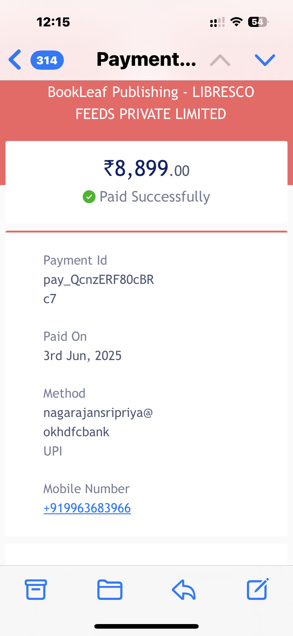 Complaint is against bookleafpublishers they charged registration fees of 1999 for entry into their pietry challenge and an additional 8899 for priority publishing in 15 days . Book submitted on June 3rd . Neither is the book published nor are they refunding the amount paid. Several tickets raised several watsapp texts sent no action taken