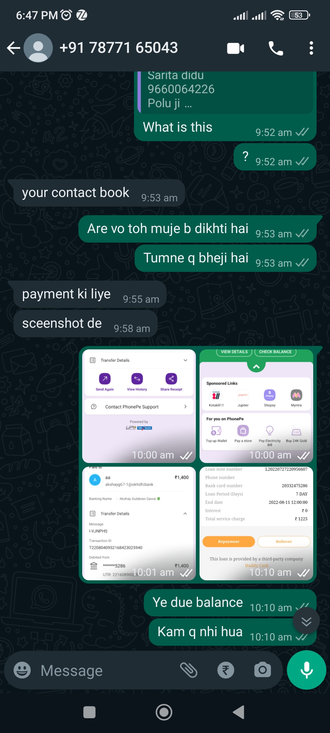 I have taken a loan of Rs. 3499 from buddy cash loan app. At the due date i had paid the first rollover amount of loan amounting 1400 Rs as per loan schedule. After that they started call and abusing me to pay more amount . They have hacked whole contacts list of my phone. They have started blackmailing me and told me that they will insult me infront of my friends and relatives. When I paid the rollover amount , the app does not show any payment which I paid . App continuously shows that whole amount is pending to pay. They threatened me that they will send vulgar and abusive messages to my friends and relatives which are in my contacts list.They have my whole contact list. I am feeling very scared after this behaviour of employees of buddy cash loan app. Please file case against the buddy cash loan app . Buddy cash app loan is seems like an app managed by criminals because they use abusive language to me everytime. Please take action against them ?????. When I saw the negative comments of app in play store..i saw that many other people are suffering from same incident.. many customers are harassed by this app. Buddy cash loan employees always call me on whtsapp and their phone number remains switched off whenever I want to do normal call .