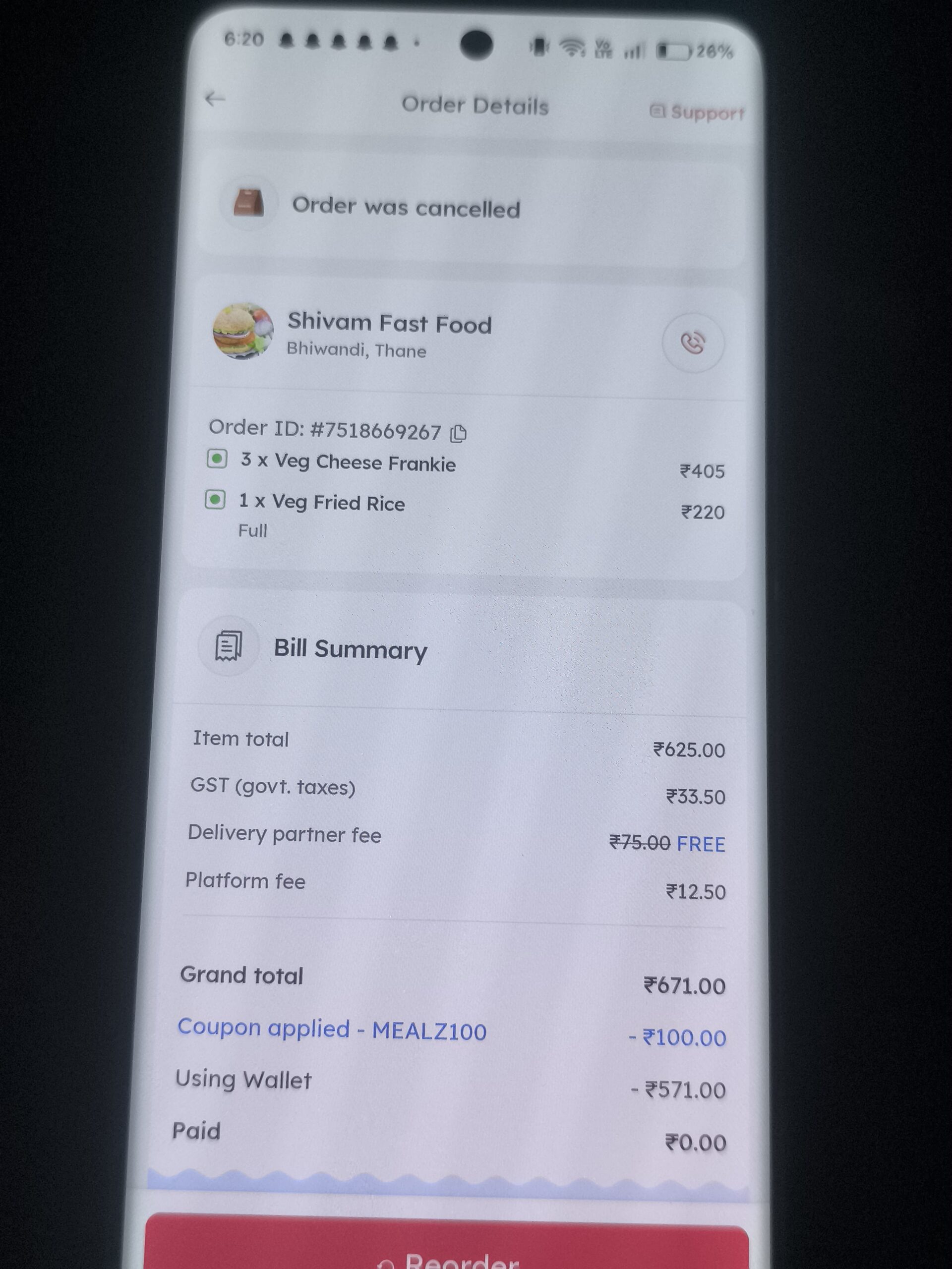 Following the cancellation, the full order amount was deducted as a cancellation charge, even though the cancellation resulted solely from the app’s malfunction. This has caused undue financial loss and inconvenience.