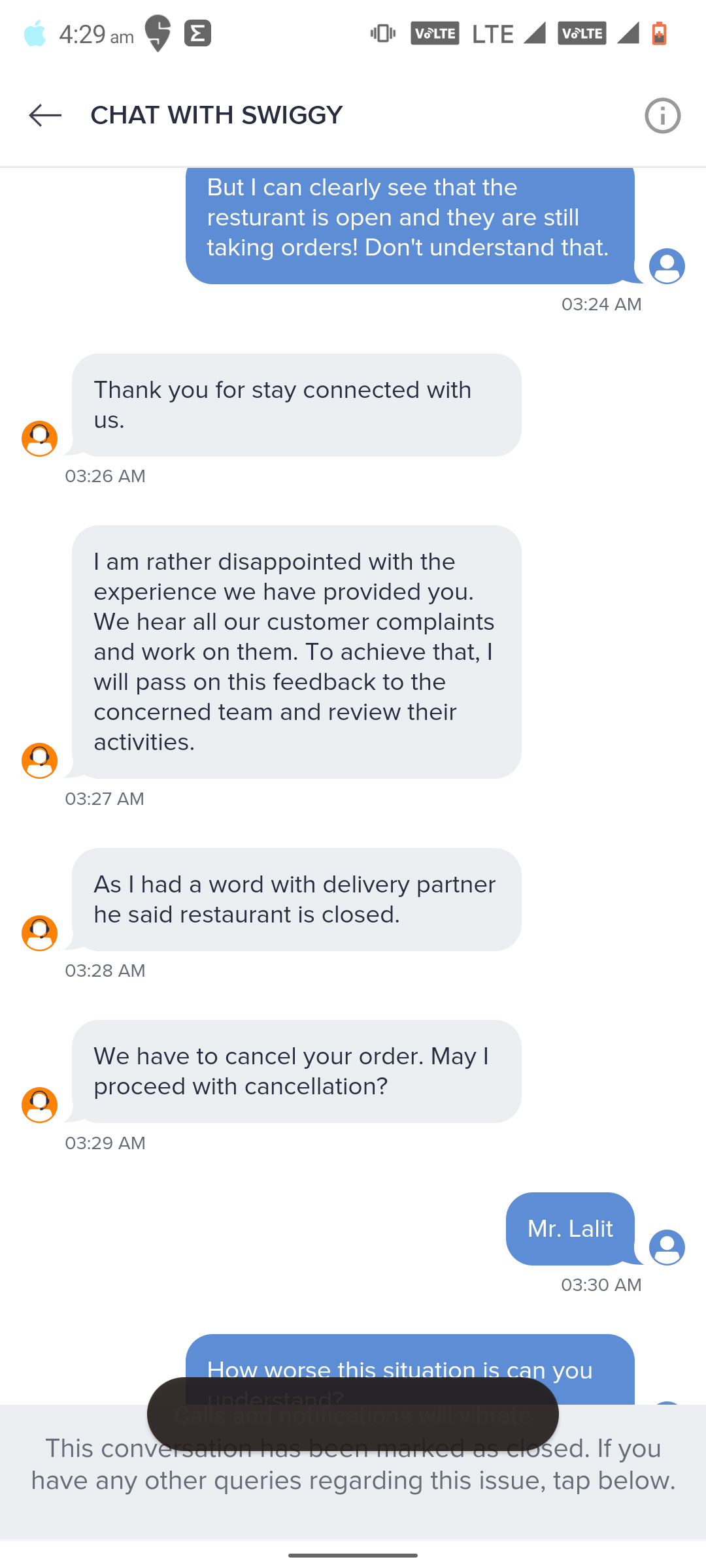 Placed the order at 2am, the delivery partner calls at 3am and asks me to cancel the order with the reason being “the resturant is not open”. I contacted chat support and they told me the same thing which was a lie as I spoke to a person from the resturant (on the number which was provided in the app after order) he confirmed that my order is ready and the delivery partner hasn’t arrived yet to pick it up! When I asked the chat support with whom he has confirmed if the resturant was really closed, he cancelled my order and refunded the amount. It was 4am ans still hungry. I even got an automated call from swiggy which they usually do if the food is being delayed. My point it is I’m the one who’s suffring because of the swiggy staff’s miscommunication. They all they did was to apologize for the issue.