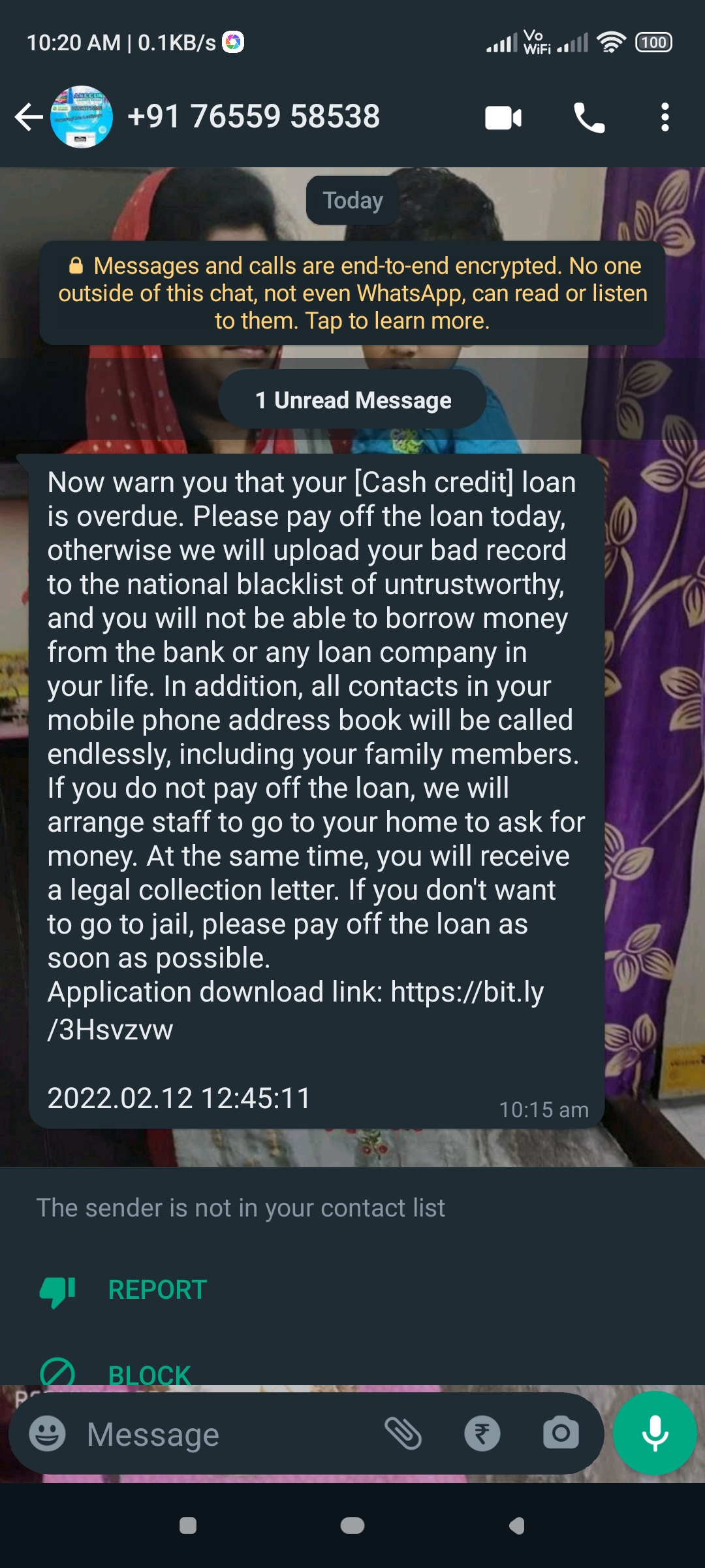 Now warn you that your [Cash credit] loan is overdue. Please pay off the loan today, otherwise we will upload your bad record to the national blacklist of untrustworthy, and you will not be able to borrow money from the bank or any loan company in your life. In addition, all contacts in your mobile phone address book will be called endlessly, including your family members. If you do not pay off the loan, we will arrange staff to go to your home to ask for money. At the same time, you will receive a legal collection letter. If you don’t want to go to jail, please pay off the loan as soon as possible.
