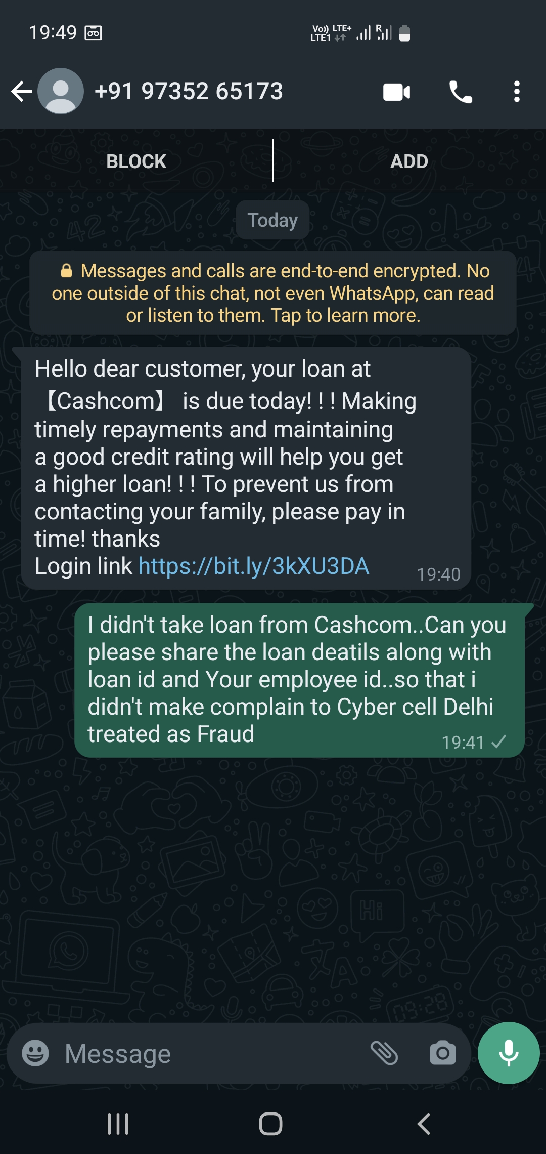 I have never taken any loan from cashcom app, even didn’t download the app. Still got the frequent messages from loan repayment over the whatsapp from different numbers (i.e 9735265173, 9854803051)..i don’t know from where they get my number, there is clear case of Fraud and phonebook hacking…