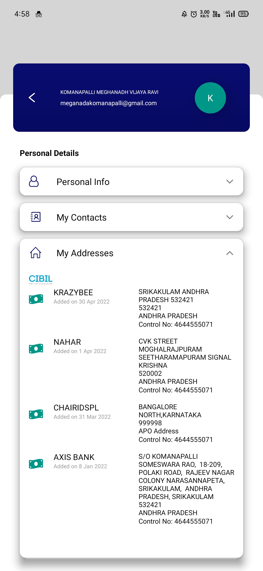 Im using cibil score app there it is showing you have mentioned different address so i checked into it it was showing a wrong entry known chairidspl which I was never known about that it was showing wrong adress too and that makes negative impact on my cibil report