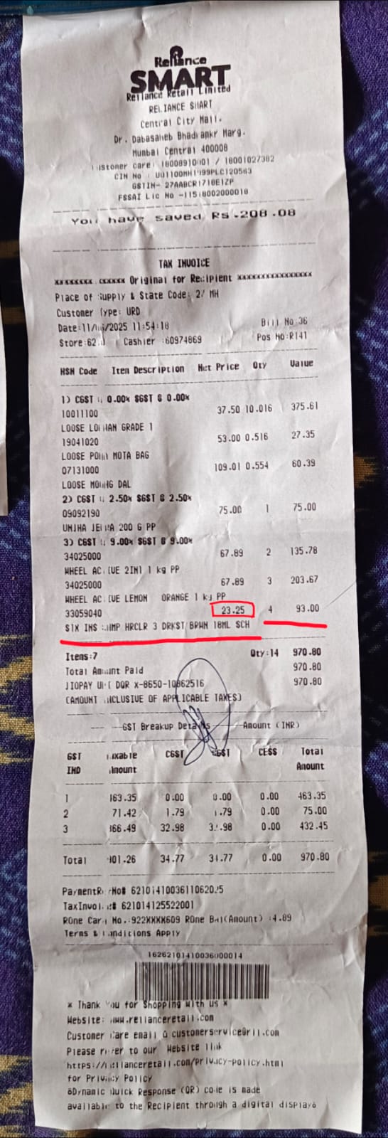 i had purchased 4 sachets of streaks hair color dark brown of Rs.20 each x 4 pcs = Rs.80/- but in my tax invoice no.36 dated 11-06-2025 unfortunately i have been charged more than mrp price i.e @ Rs.23.25/- per peice x 4 sachets = Rs.93/- I had raised my complaints and concerned with the respective employee at relaince smart mall at mumbai central, your on duty complaint officer was saying that she cant do anything in that, our system price is showing Rs.23.25/- per peice we cant do anything, I and my mom said to her more than mrp in your systems she said yes. So my question to relaince smart team y all customers have been cheated till now. Y we had paid more than mrp for the product. Y the corrections in amounts more than mrp has not made till now. y i have been charged more than mrp. Even She said to my mom that u will get more than mrp price at other market. my mom said no im getting at same price at mrp of Rs.20 only. Kindly refunds back to original source at earliest otherwise will take some legal actions in consumer court. I had attached tax invoice for ur ref purpose.