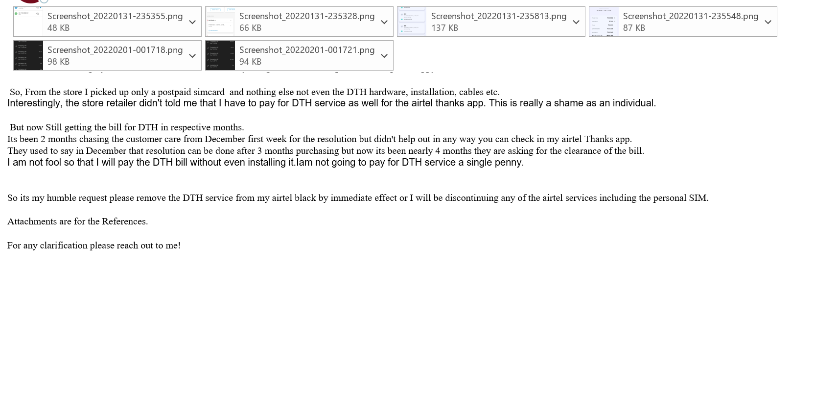 So its my humble request please remove the DTH service from my airtel black by immediate effect or I will be discontinuing any of the airtel services including the personal SIM.
