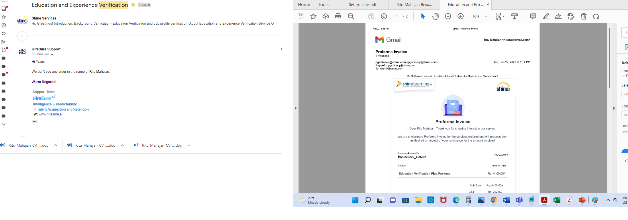 I registered for Shine’s job services after much follow up by them in Feb. After I paid my registration fee-3kplus, I was told that it was super important to get my exp and education verified by their service providers to reassure employers about our background. They charged me additional 5k plus for that, and I have received no service, even after a month. The invoice shows that 3k out of the total amount is for a negotiation skills course that was never discussed and I never asked for it. Post that, the Hire sure services says there is no record of services owed to me. Also, the whole service seems to be just about verifying my highest degree, nothing more, nothing to do with background check on experience at all. Every time I contact them or write to them, they promise a call back/update and nothing happens.