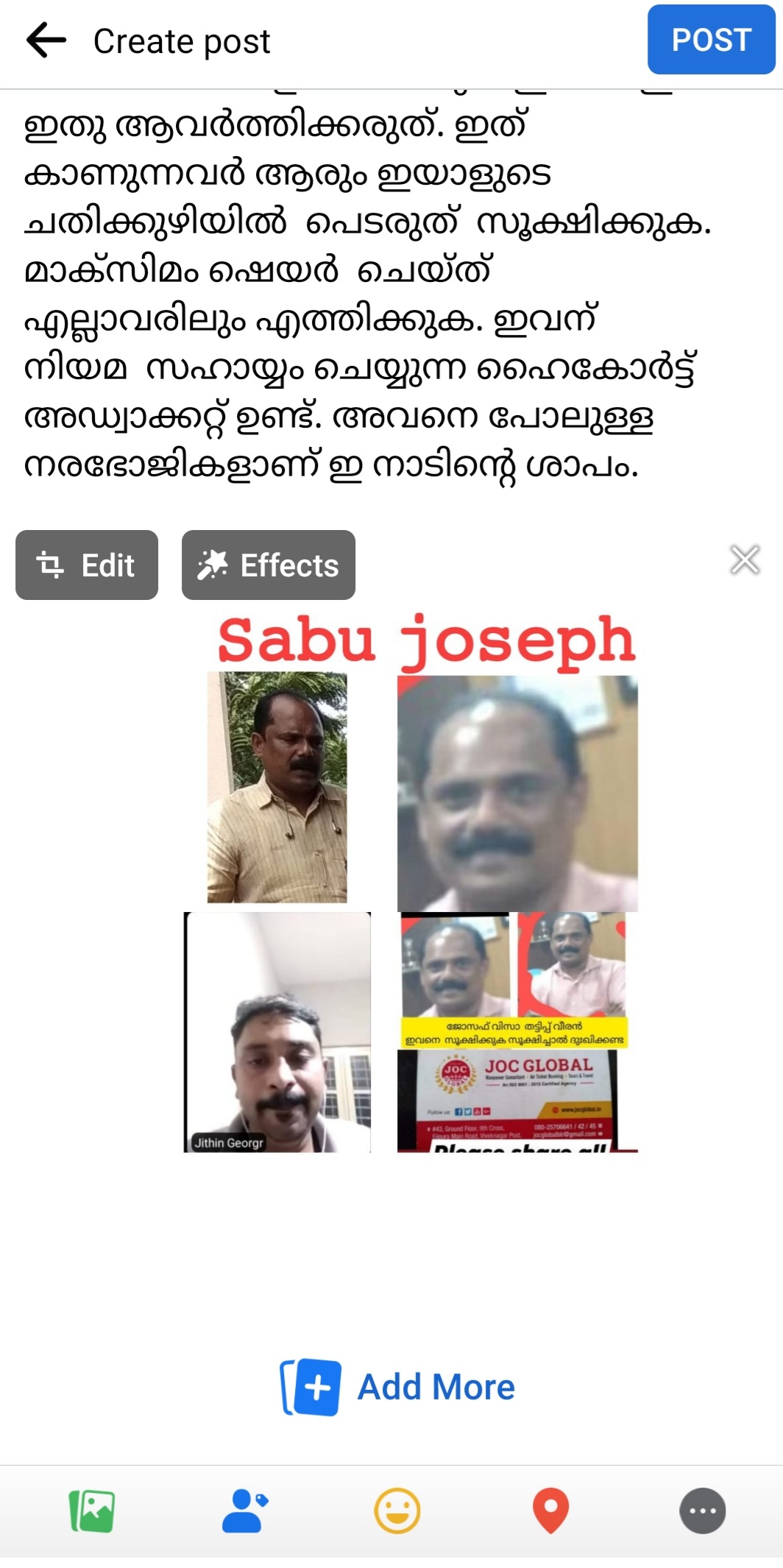 sir Europe job visa for our more than 500 people was announced and lakhs were bought from one person and crores of rupees were taken from many people and sank from India now uae based new travels are starting to recruit people from there jcc to Europe many people there cheating sir take the initiative to stop it sir Sabu Joseph he is a big fraud sir we should not allow him to do this We have lodged a complaint with the Chief Minister of Kerala with this sir we do not have any danger to anyone else sir do not allow him sir pls send me along with his passport copy pls sir I humbly go to him for a job now Death Advocate sir pls help