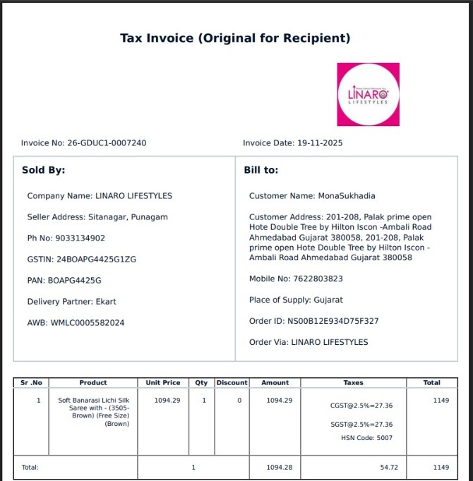 Kindly take action against LINARO LIFESTYLES as well as Blue dart as they are not keeping the information of sender and denying for refund of money.