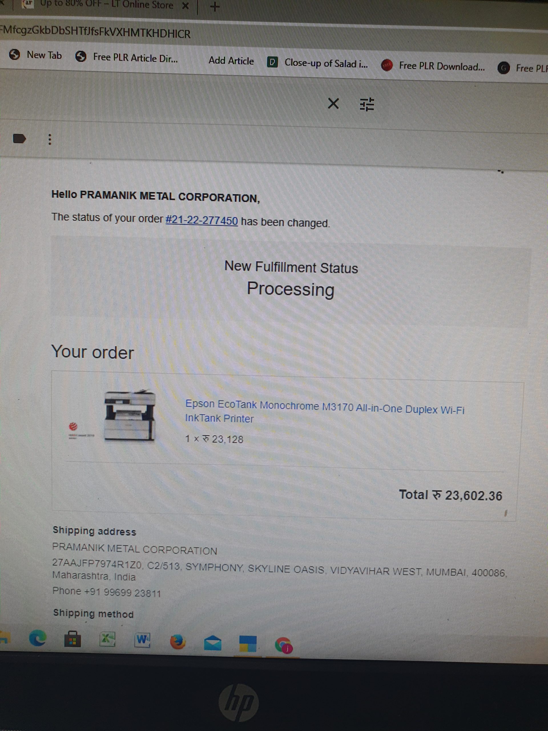 I have ordered an EPSON ECOTANK MONCHROME PRINTER M3170 order no. #21-22-277450 on 31st Aug 2021. I have made an online payment at LT online Store (gst no.27AKKPD4046M1ZY)