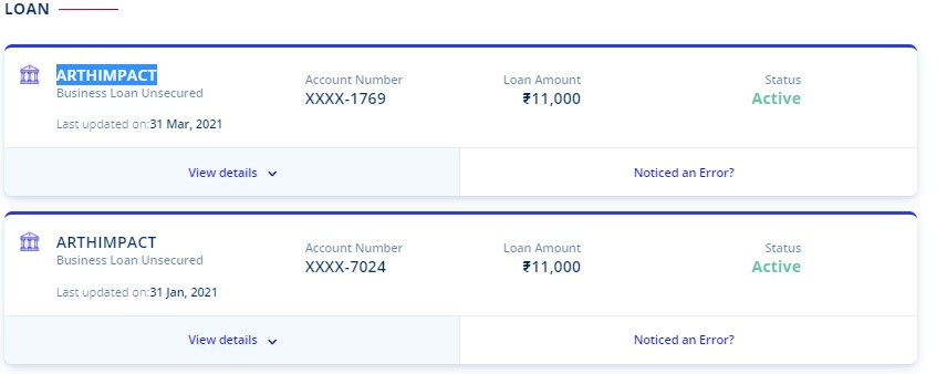 I haven’t applied for a loan and in my cibil score there is showing 2 loans from ARTHIMPACT private limited of 11,000