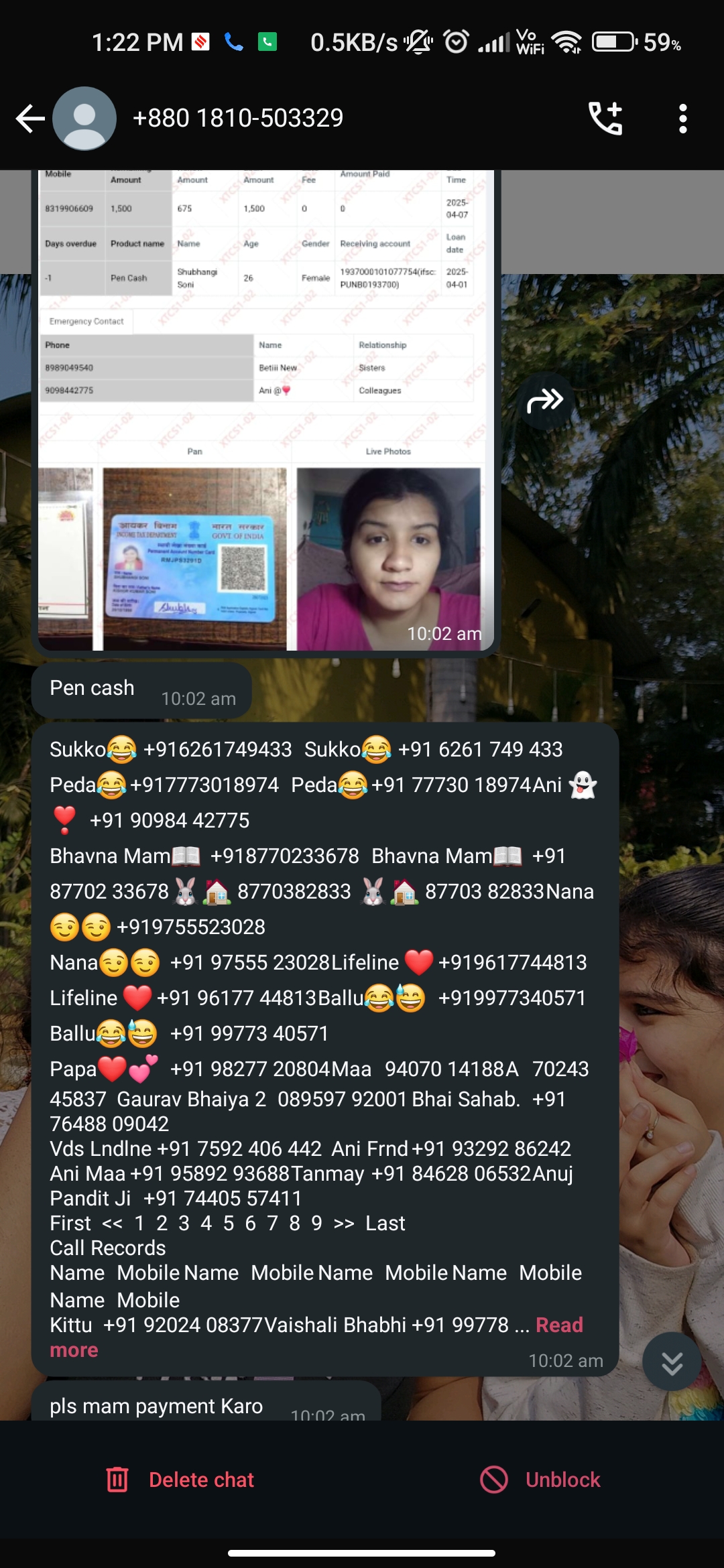 Today (06-04-2025), when i was get up in the morning, i got one whtasup message it was about loan repayment, they said you took 1500 rupee loan from us, infact in didn’t took any single rupee from them, now they are blackmailing me, they showing me my own contact list, and said if you don’t pay money, we will call your family and frnds.