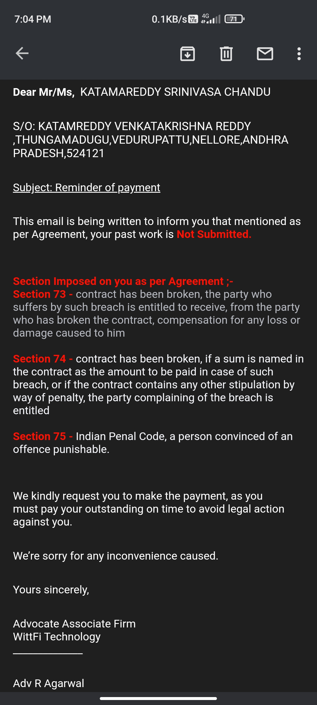 One day I got call from a number, they said this is a no investment part time job you need to complete 600forms in 6 days, if you faill to do this work you need to pay penalty charges to the company and they a agreement from me, the next day I was started the work due to heavy rains I’m unable to that work I said I can’t do this work they said you need pay as per agreement. I sent a fake transaction receipt to them, they said your file is forward to legal department .today j got mail and call from legal department they said a notice will come and police also come yourhouse which is near to you city police station please help me I’m poor student my father is farmer please help