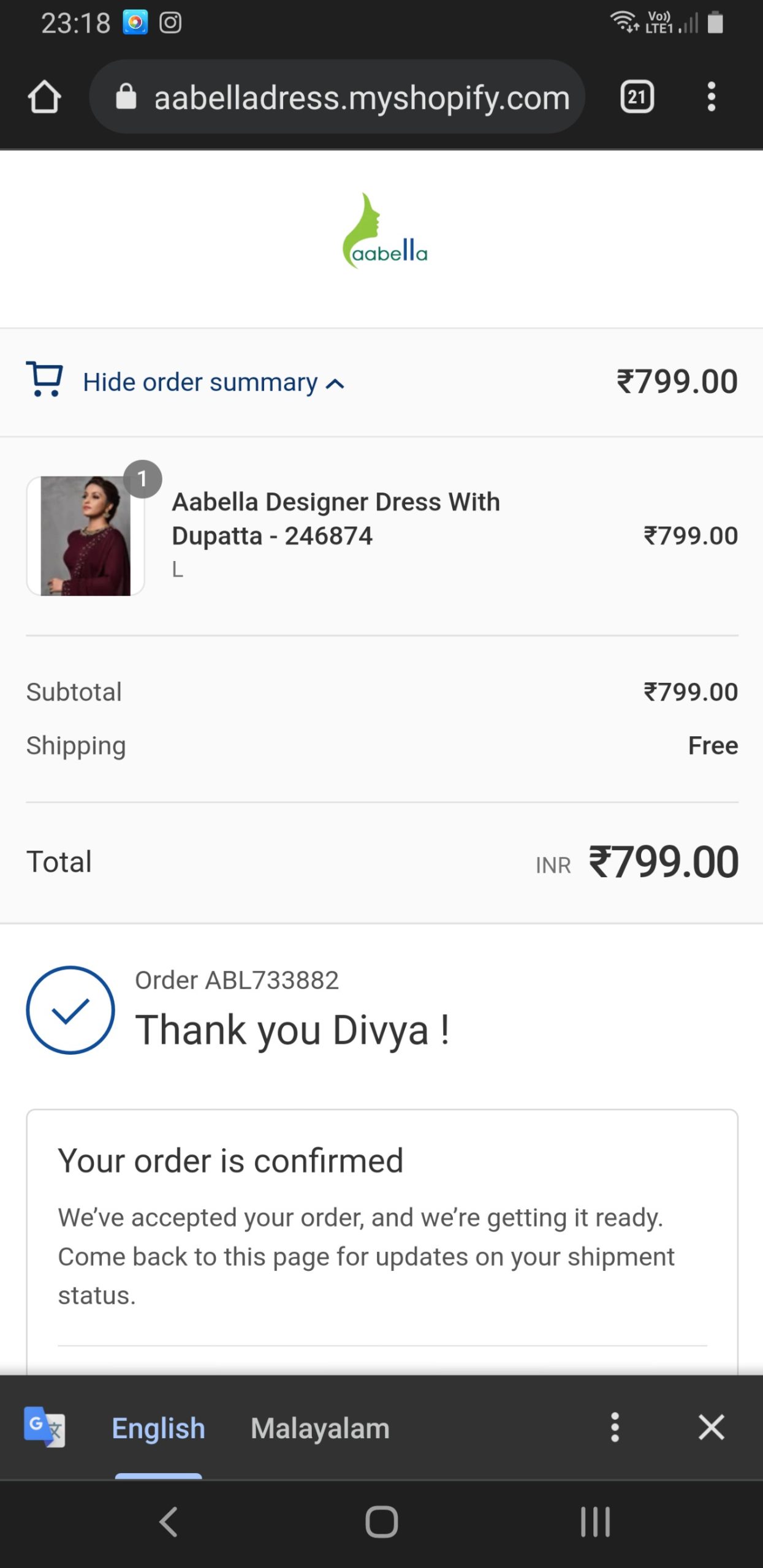 Ordered a churidhar fro. Aabelladress.com and delivered a damaged cheap saree. I want either refund or return