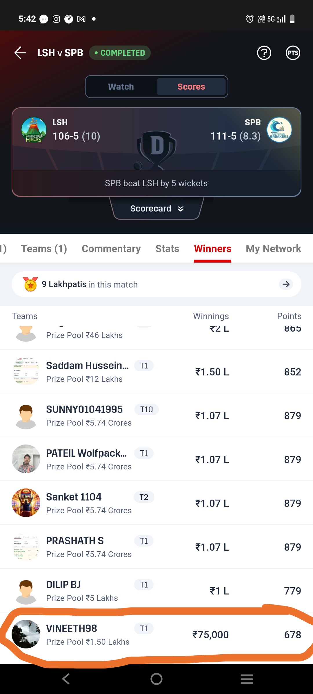 I have participated in a contest between LSH vs SPB on 17-04-2025 with my team “Dinesh DreamTeam 596344”, and I scored 716 points and got only 49 rupees but another player who namely VINEETH98 who has scored only 678 have awarded 750000 case prize . I strongly believe that there has been an error in the prize allocation, and it seems that my rightful winnings have been mistakenly awarded to someone else. I kindly request you to review this issue at the earliest and rectify this mistake. If this is indeed an error, I urge you to credit the correct winnings to my account. I have attached screenshots for your kind reference, which clearly show the difference in scores and the incorrect distribution of the winnings. I would greatly appreciate your prompt response and resolution to this matter. Thank you for your time and assistanceparticipated in this contest with my team “RAVI BANDITS 587120”, and I scored 1,131.5 points. However, despite having a higher score, I received only ₹60 as my winnings. On the other hand, another participant with the team “Raj Winners 1503”, who scored 1,122.5 points, has been awarded ₹10 lakh as the prize. I strongly believe that there has been an error in the prize allocation, and it seems that my rightful winnings have been mistakenly awarded to someone else. I kindly request you to review this issue at the earliest and rectify this mistake. If this is indeed an error, I urge you to credit the correct winnings to my account. I have attached screenshots for your reference, which clearly show the difference in scores and the incorrect distribution of the winnings. I would greatly appreciate your prompt response and resolution to this matter. Thank you for your time and assistance.