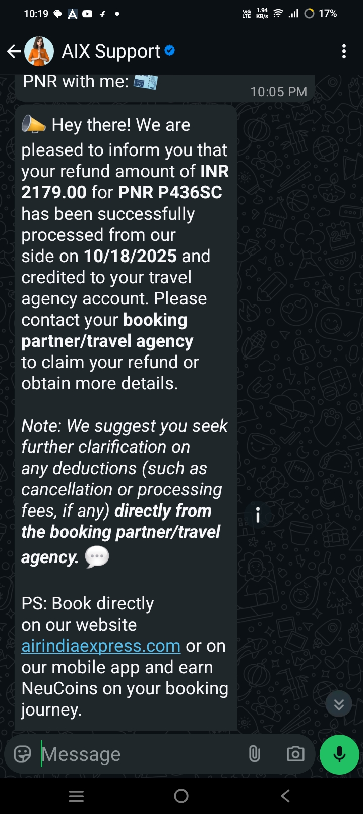 I had booked an Air India Express international flight from Trichy to Singapore through Flipkart Travel (Booking ID: [250919553340], PNR: [P436SC]). I missed the flight, and as per airline policy, I was eligible for a partial refund (airport taxes).