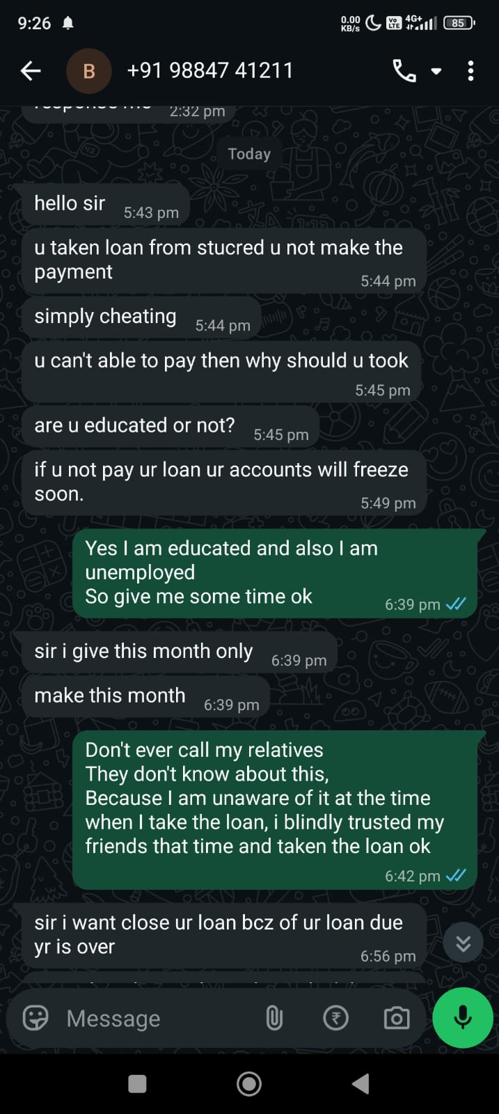 An agent is threatening and contacting my personal contacts,threatening my parents. And told them to pay 43000 for a loan of 10000 in stucred app. I demand that cease this harassment immediately.