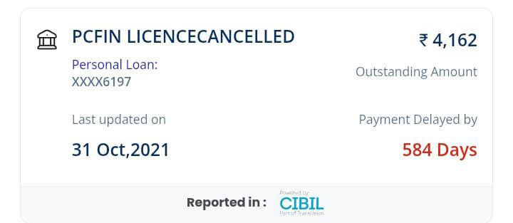 I Shruti Kumari, residing at Bokaro, Jharkhand wish to file a formal complaint against a financial institution named PCFIN, whose lending license appears to have been cancelled, as per the attached credit report information. Despite this, they have reported an overdue personal loan of ₹4,162 with a delay of 584 days on the CIBIL credit bureau report, last updated on 31 October 2021.