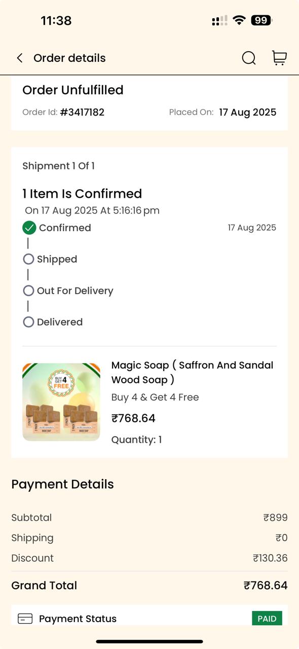 Hi Team, I have ordered 8 ghar soaps from their official appplication and paid INR 768 at the time of ordering and now since that time I am following up with them via email and their support chat but they are not giving me a proper update and not giving me a satisfactory answer.