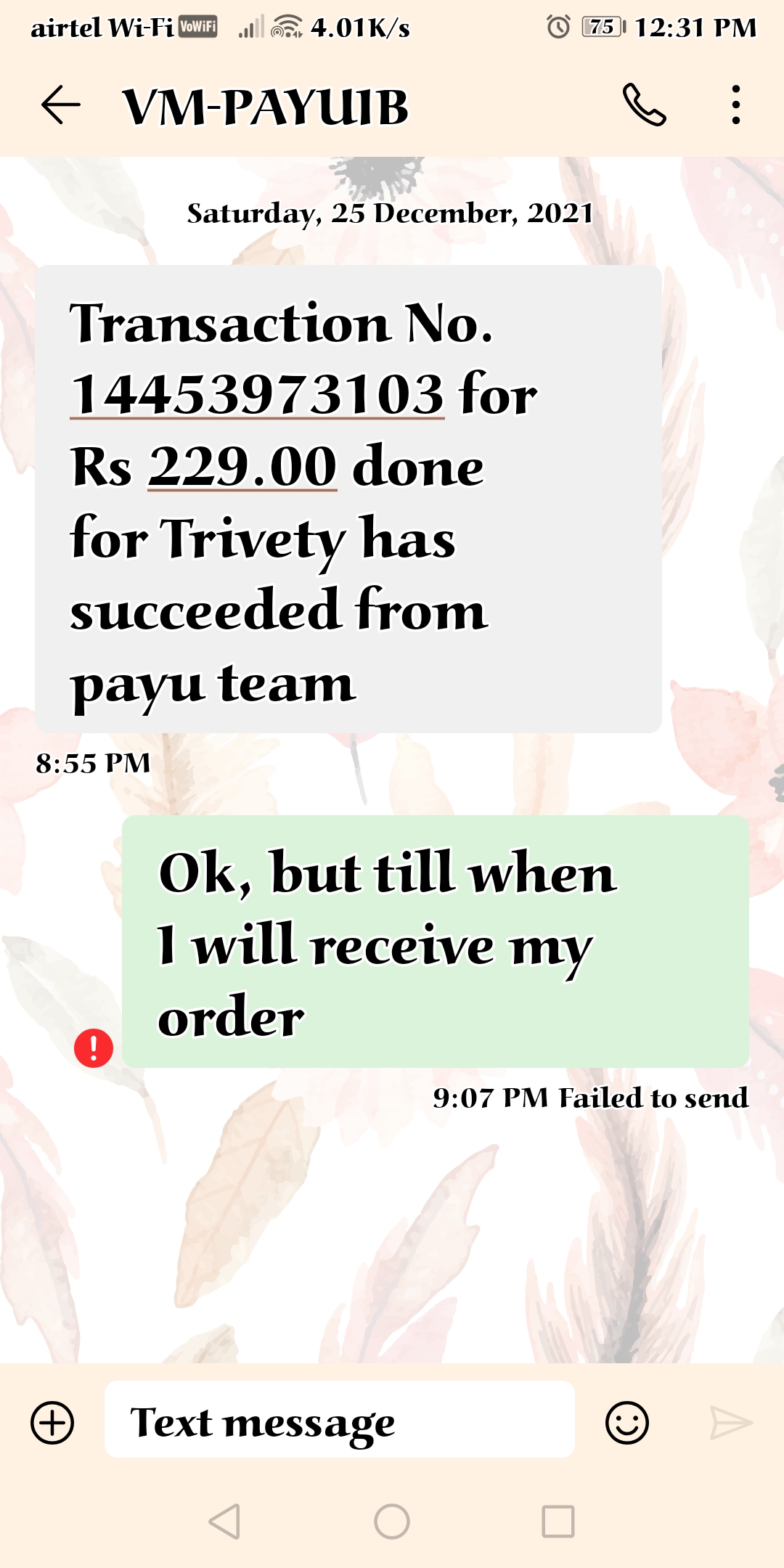 I had done payment of rs. 229 for trivety. reference no is 14453973103