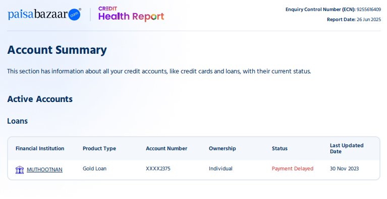 • Lender as per CIBIL Report: MUTHOOTNAN (Muthoot Fincorp Ltd / Muthoot Nannayam Finance)