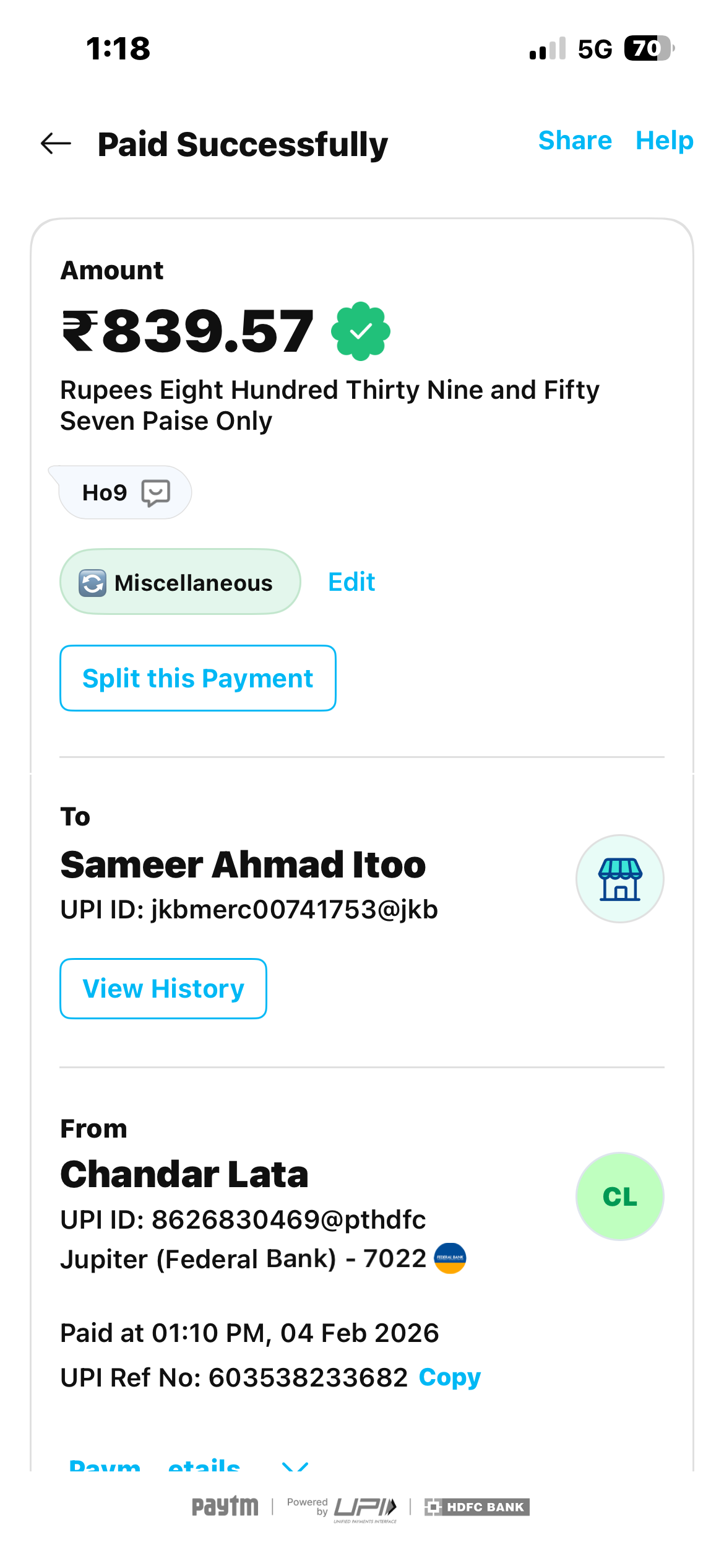 Thank you for bringing this matter to our notice. We understand your concern regarding the wallet top-up transaction of ₹840 dated 4 February 2026 made via Paytm (Transaction ID: 603538233682).