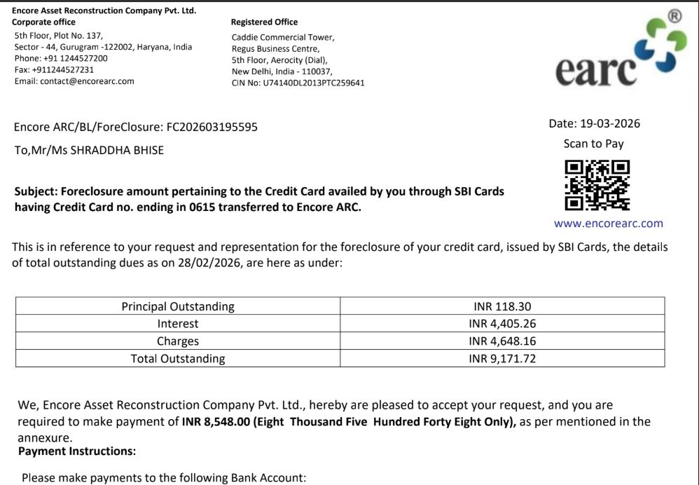 I wish to bring to your attention that representatives of Encore Asset Reconstruction Company Pvt. Ltd. have been reaching out to me claiming that there is a pending due amount against my SBI Credit Card account. As per their communication, the alleged outstanding amounts are as follows: