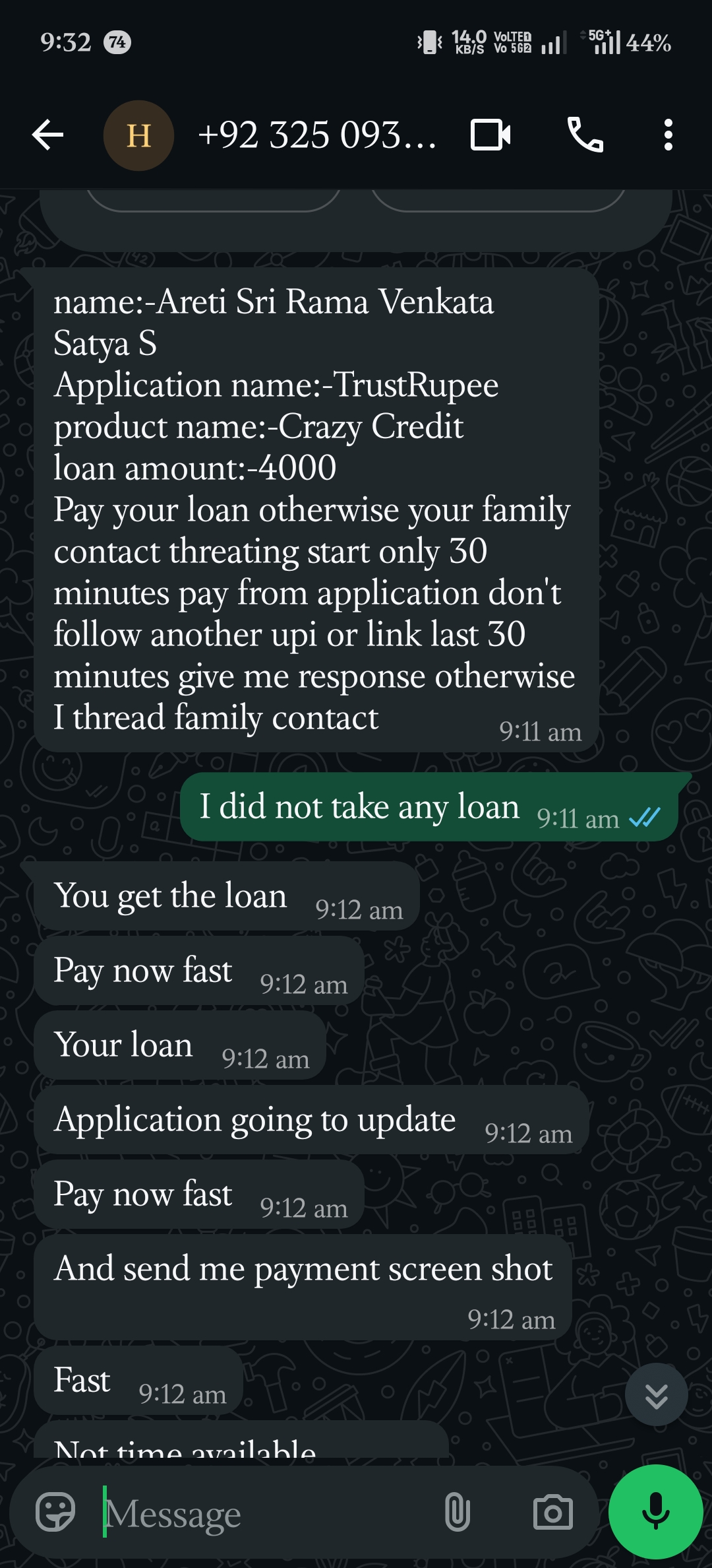 I did not take any loan from crazy credit but they are trying to message me on WhatsApp and trying to pay they are saying that they have all your contact numbers and photos also