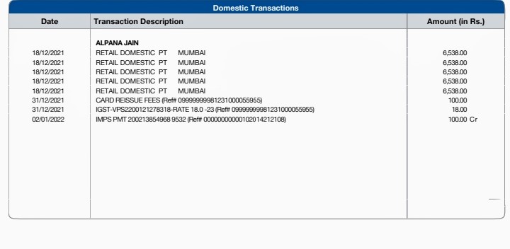 On date of 18/12/2021 my card is in my home address and on that time so many OTP was come in my mobile and 5 transaction is occured with adress Retail domestic PT Mumbai. And transaction amount is 32730 rs.
