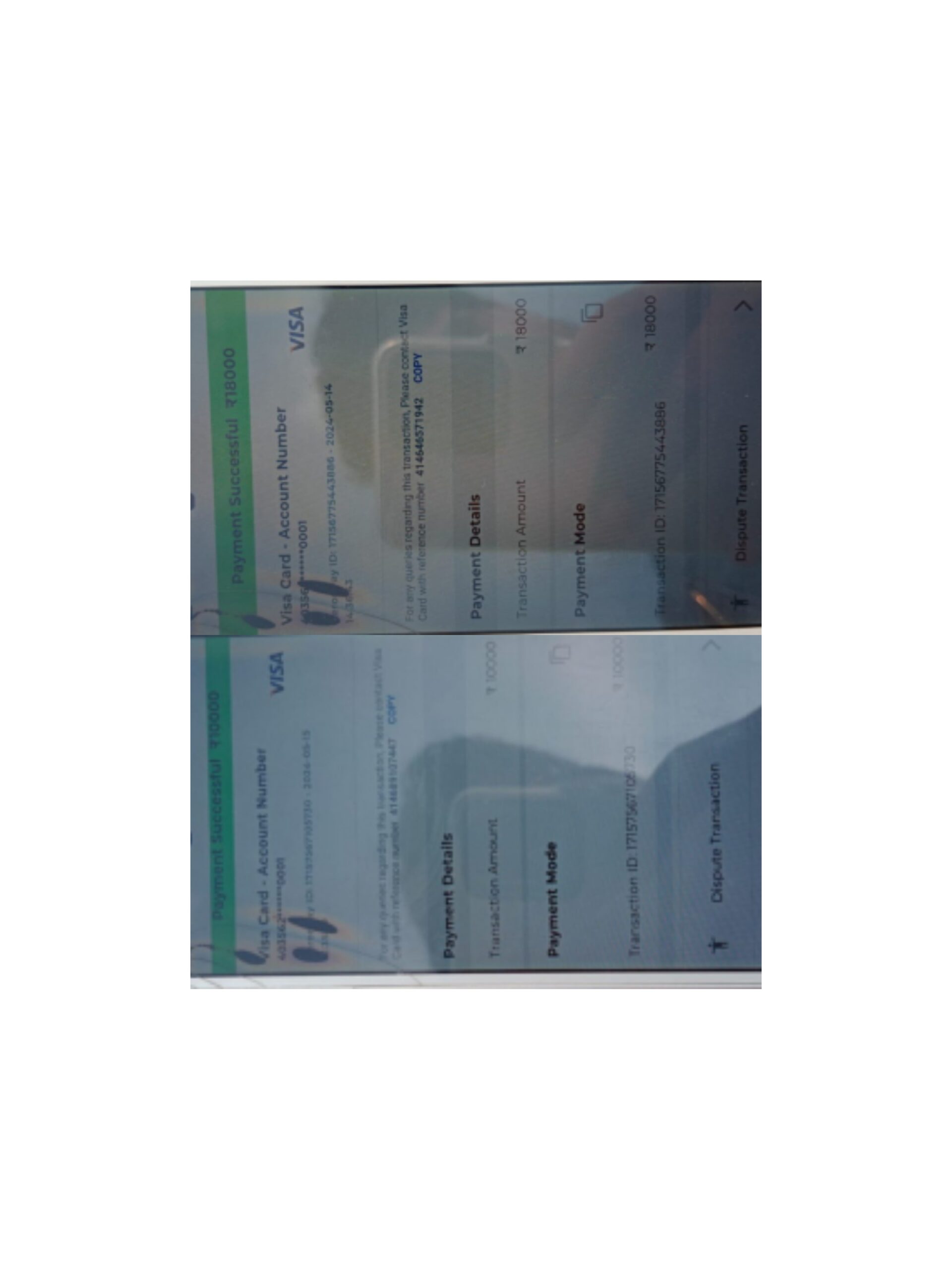 मैंने अपने क्रेडिट कार्ड पर दो पेमेंट 18000₹ का 14/05/2024 को और 10000₹ का 15/05/2024 को किया था जो कि अभी तक अपडेट नहीं हुआ है जबकि पेमेंट सक्सेस हो गया है लेकिन पेमेंट अभी तक अपडेट नहीं हुआ है