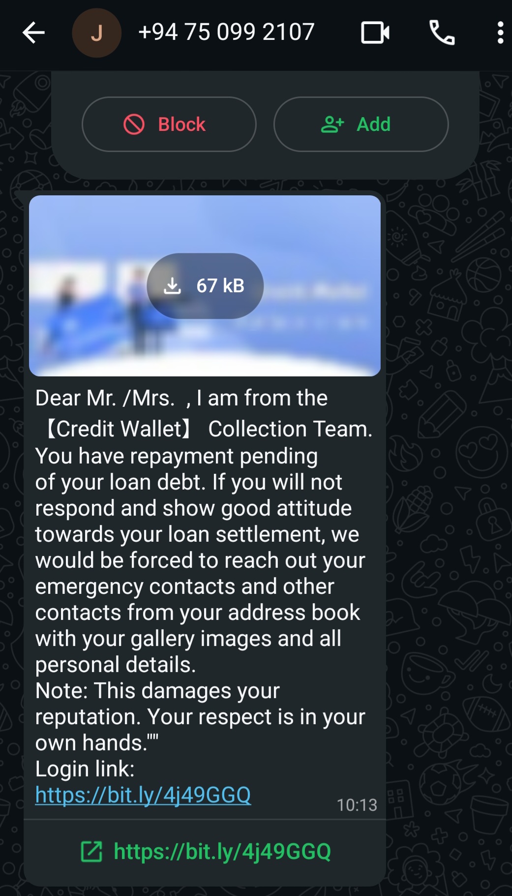 I got message from creditwallet from international number asking for repayment of loan amount which is not taken..Completely scam and request you to take action immediately….