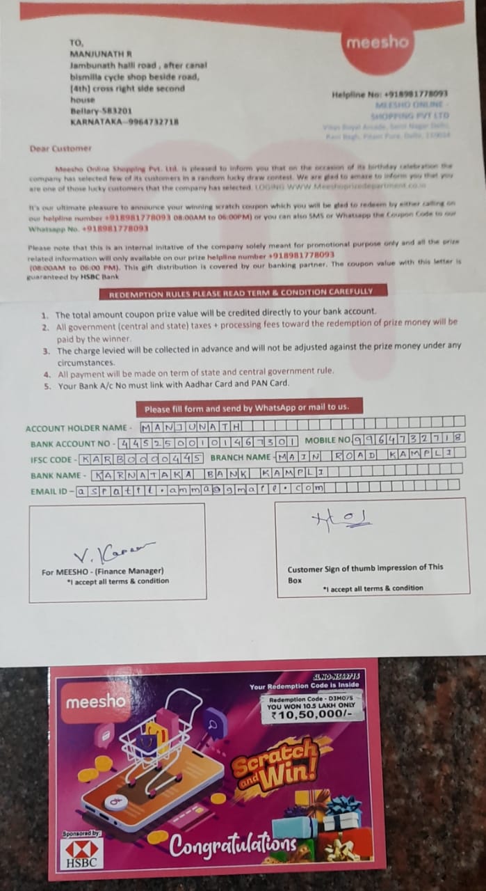 I received msg from cp like Dear. congratulations! Your order number Win the first prize that is Voucher Money ( RS 10,50,000) in lucky draw from our Meesho