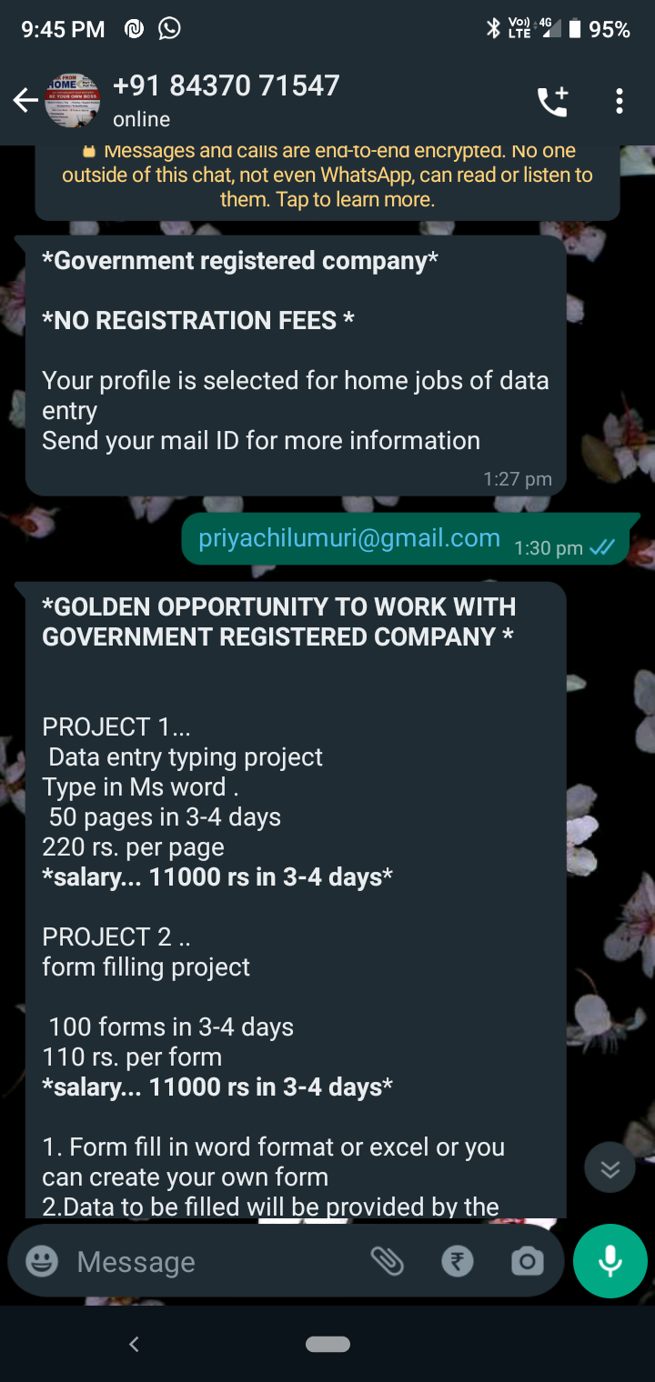 Frist they message to me like u select for the data entry after I pay money refunded after 3hours I didnt get my salary back
