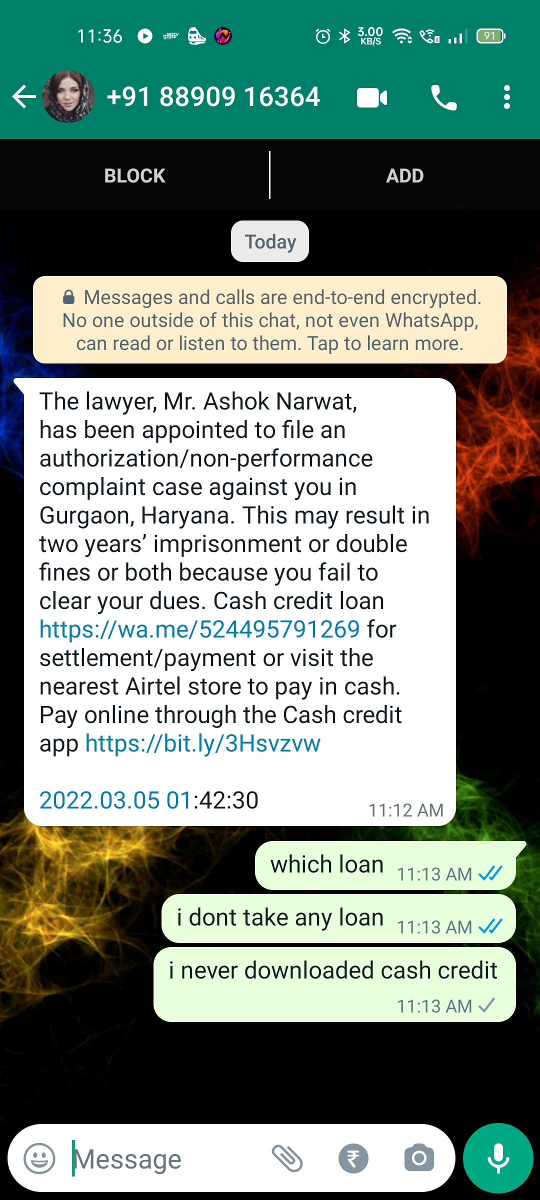 Getting whatsapp messages from multiple new numbers stating to repay loan from Rupee Mall app from where i have never secured any loan. Have attached the content of the message below. Fake loan recovery message from cash credit