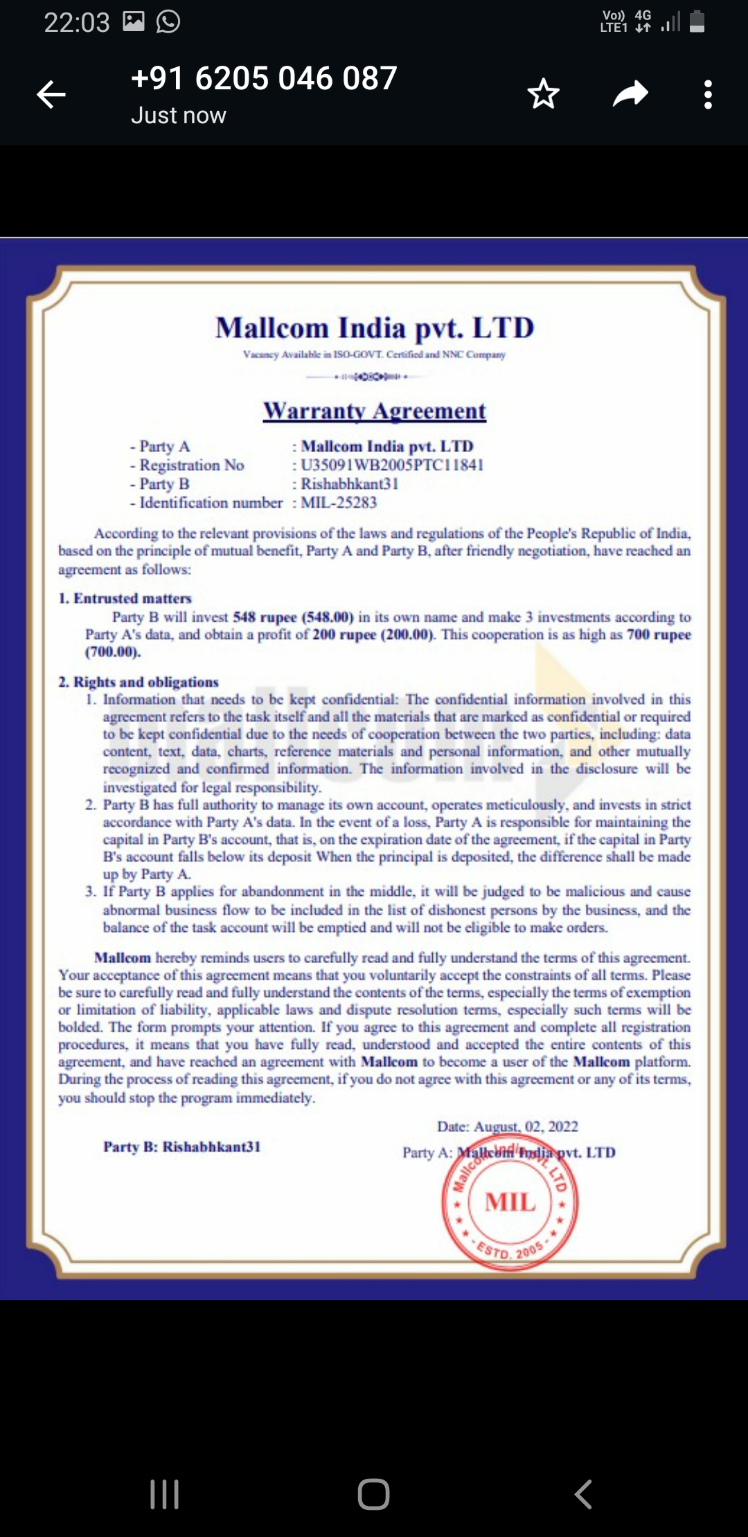 Cbyer crime in mallcom india pvt LTD certificates registration number isU35091WB2005PTC11841 they do you want to learn how to earn money by side the registration on link the give 100as funds they say keep recharge to complete the task after withdrawal. Vip 2 complete the withdrawal would not successfully. They say vip task 3 enter in recharge high pay and 20% commission on the product on delivery marketing