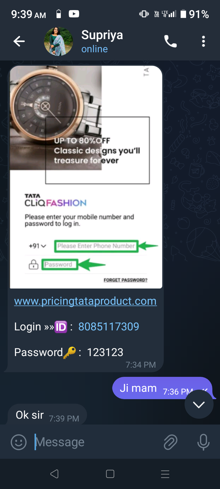 Sir mere sath telegram se fraud hua hai ek do baar cash in karne par cash out bhi hua hai but tisre din ko 3 baar cash in kiya ab 175965 mnga rhe tabhi cash out ho pyega ye bol rh tata cliq fashion ke naam me ek site ke dwara meri login id banai gai hai jiske sath aisa hua hai