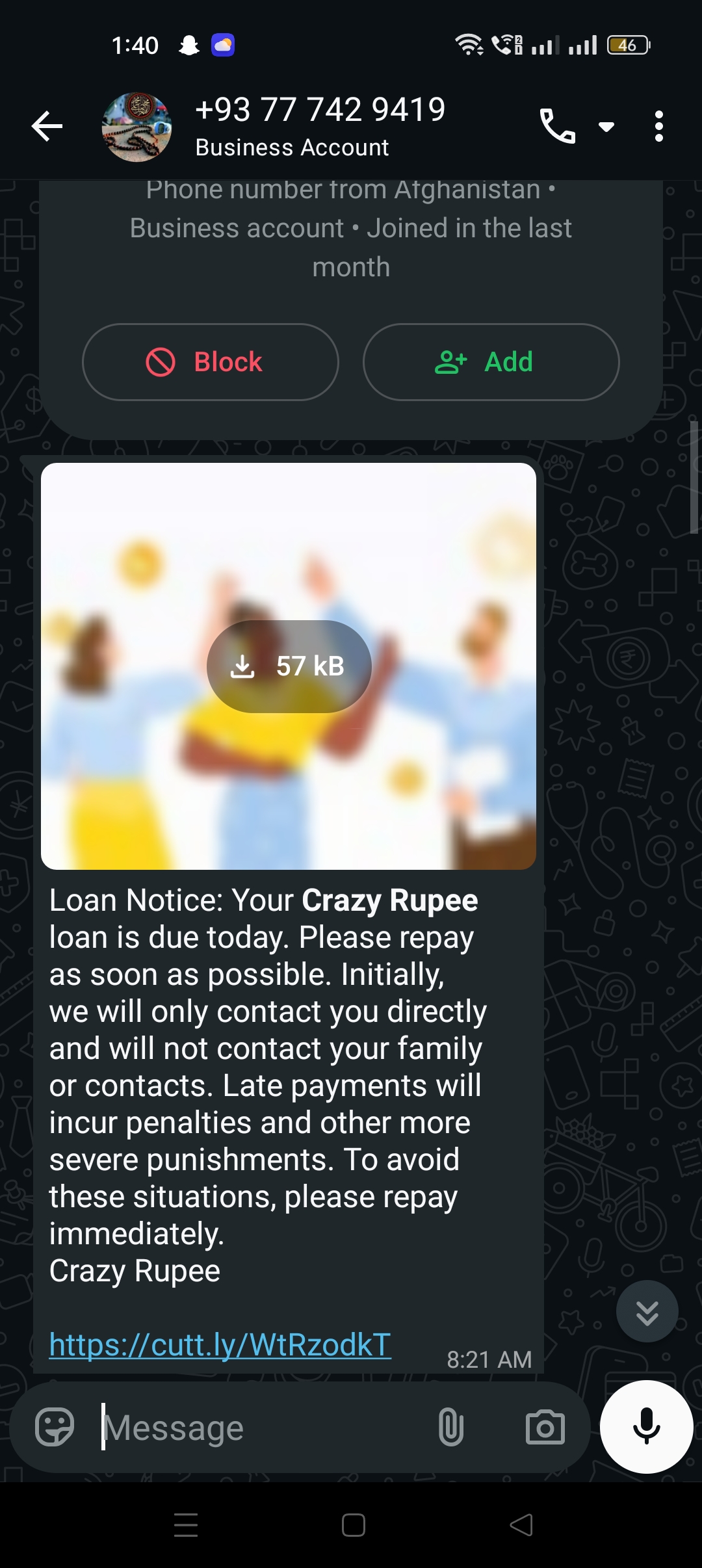 I have not taken any loan from crazy rupees still thy contacted me in WhatsApp and sending msg your loan is due today and threatening like we will call your contacts..so kindly please take action…they r sending message from afganistan number and Pakistan