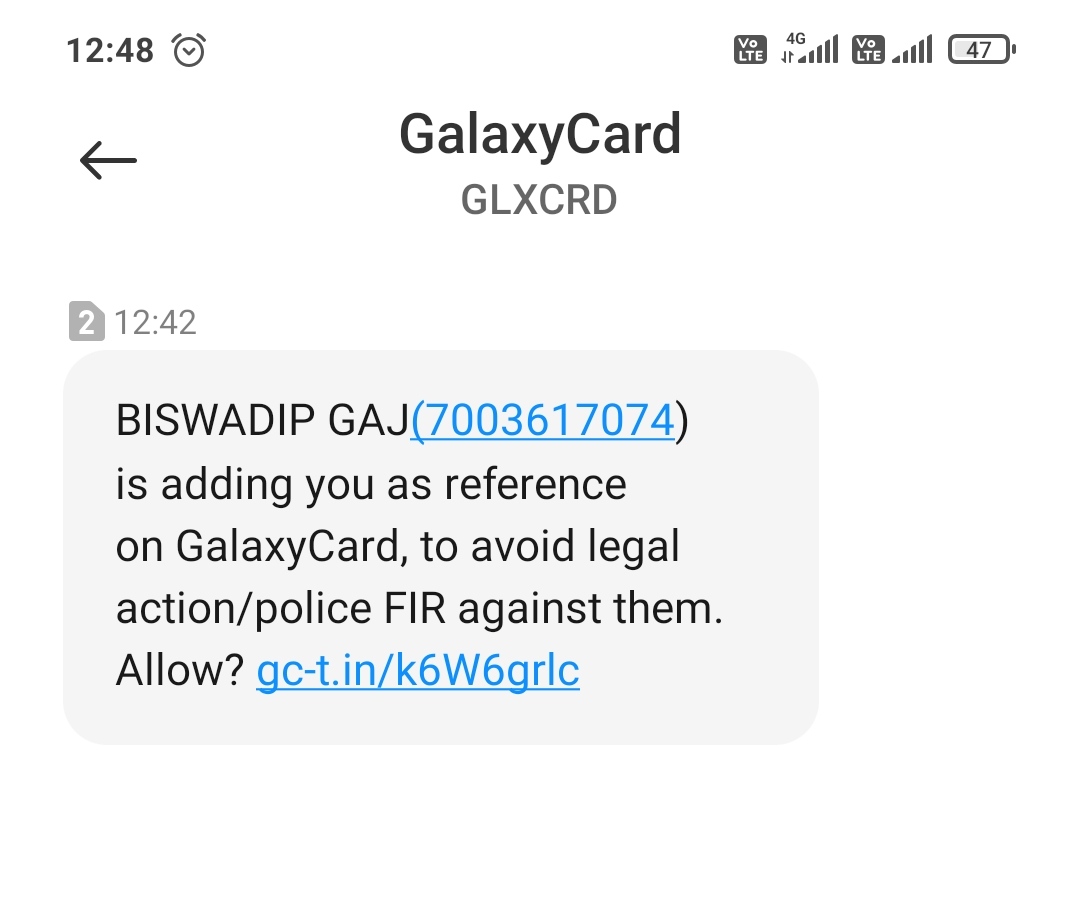 BISWADIP GAJ(7003617074) is adding you as reference on GalaxyCard, to avoid legal action/police FIR against them. Allow? gc-t.in/k6W6grlc