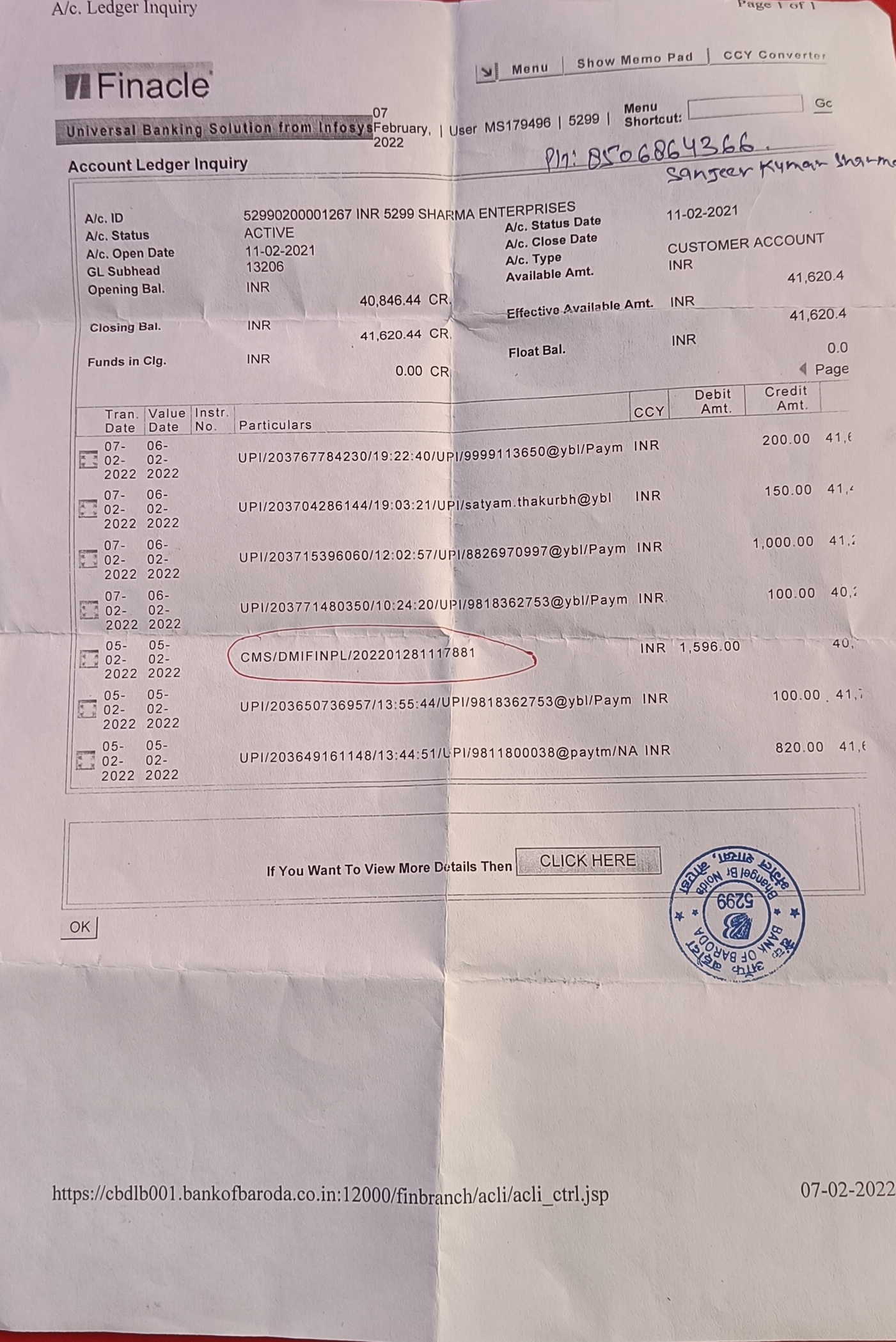 I have taken a samsung phone through dmi finance from noida and my case id dmi0006750247 have closed before 4 months. But this months 5 feb 2022 deduct 1596 rs on my another account by dmi finance and yet they are not reflecting in dmi finance. Please help me.