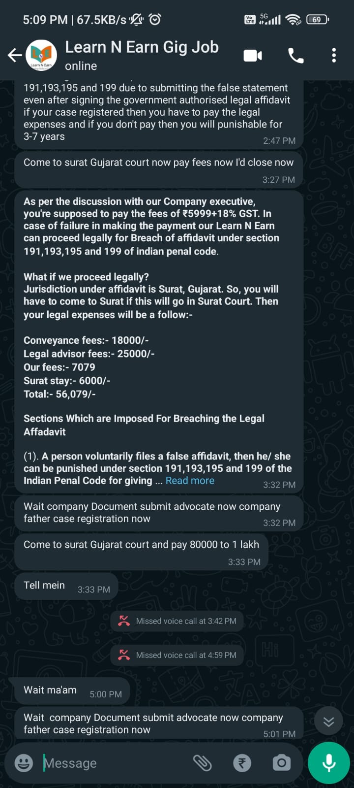 The company approached me in WhatsApp for providing an opportunity of Online Job. They asked for Passport photo, Aadhar card, my name etc. and asked me login in a portal that should have given me access to online jobs. They said to pay money only after I get paid for the first job. The links were broken in the job, and nothing worked. After 6 days, they are demanding me to pay INR 7079 by showing a paper which they are calling court papers. They are continuously harassing me with calls and messages in WhatsApp and mobile no. The document does not have any proper digital signature or any stamp that states it is legal. They are threatening me if charges are not paid in 30-45 minutes, then they will file case in Surat, Gujrat consumer commission court where I will have to pay 80,000 to 1 Lakh INR as compensation and damage charges. I didn’t take any privileges or salary from this company.