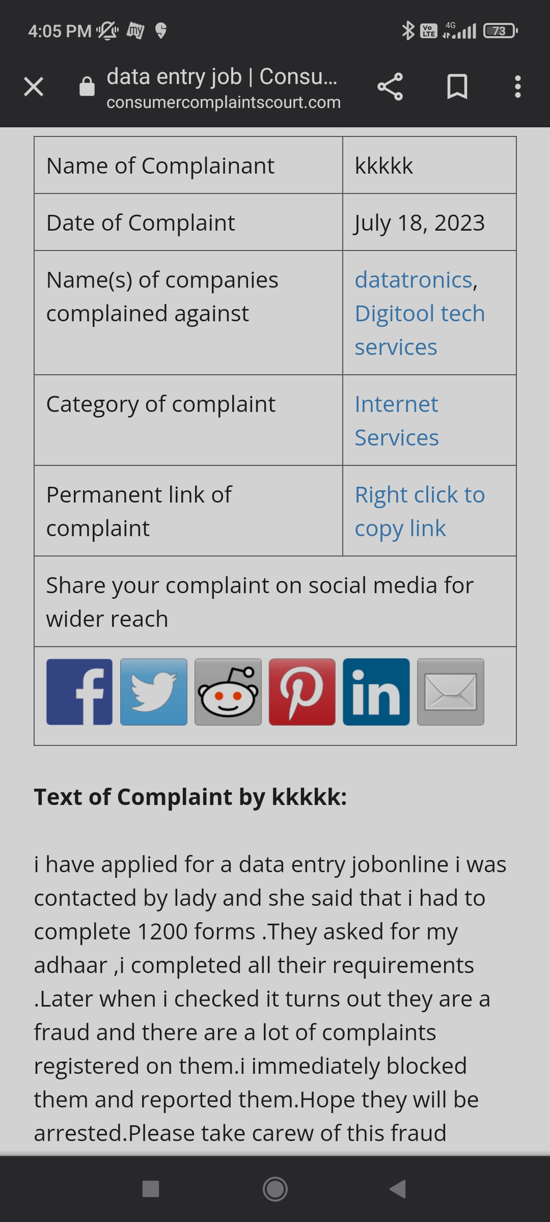 | Permanent link of complaint | Right click to copy link |