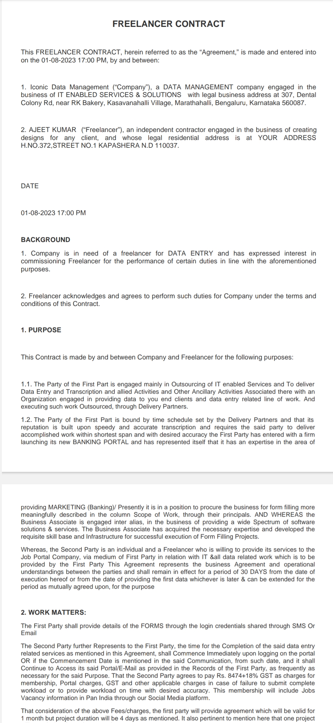 Recently I received a message on WhatsApp for Data entry job.They told me that You need to fill 375 forms with 80 percent accuracy in 4 days with salary Rs.12000-15000.For Starting your work you need send me your Aadhaar Card photos and sign a contract.I thought I can do this job easily because I just need to fill the data and my typing speed is good.So I sent my Aadhar Card photos to their WhatsApp number.Within few minutes or seconds they send me a contact (attached below) to sign then I signed the contract and sent to them.Since it was 4 days work I thought I can do easily but It was not easy The webportal (iconicdatamanagement.com) is designed in a way you cannot complete the work in 4 days.Same happened with me I cannot complete the work and next day I got call from a different phone number saying I’m legal advocate from Iconic Data Management explaining that you had a contract with my client and and failed to fullfill the same you need to pay Rs. 9999 within 15 minutes to stop legal action against you otherwise we will file a case against you for the breach of contract under sections 71,72 and 73 of The Indian Contract Act 1872 and See you in the Bangalore Court .I didn’t pay any amount to them because I’m a Student and I don’t had that amount of money.I tried to convince them about my situation but They didn’t agree and called me on WhatsApp from different phone numbers.I was panicked and I started to arrange that money from my friends but couldn’t pay because of shortage of money.They tried to put pressure on me that after the legal proceedings police will come and take you to the jail and you have to pay Rs.62000 to the company for damages and 99000 for court fee.