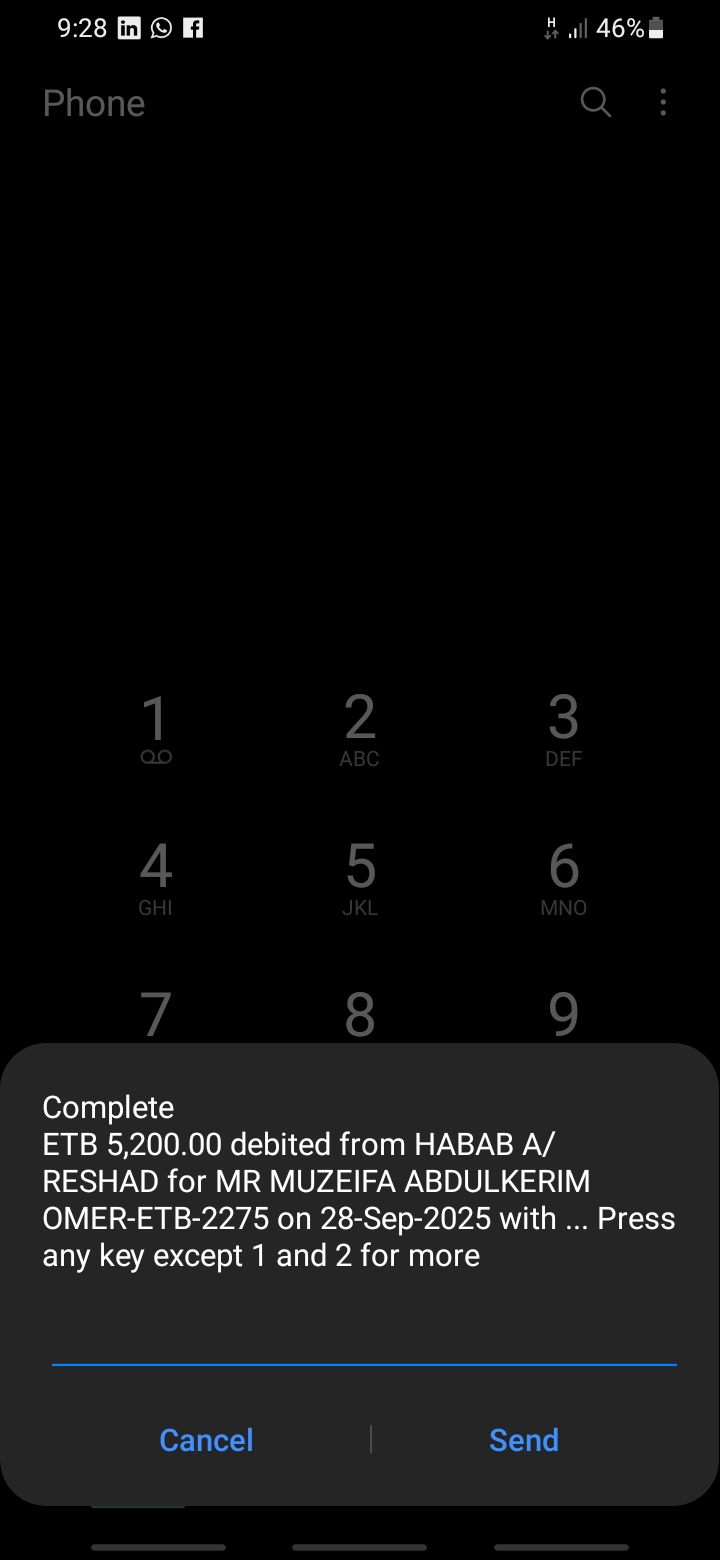 I transferred the above amounts via mobile banking to the account of Muzeifa Abdulkerim. After sending, I realized that these transactions were likely part of a scam. I request the bank to investigate these transactions, attempt to reverse or freeze them if possible, and provide me with a case/report number for follow-up.