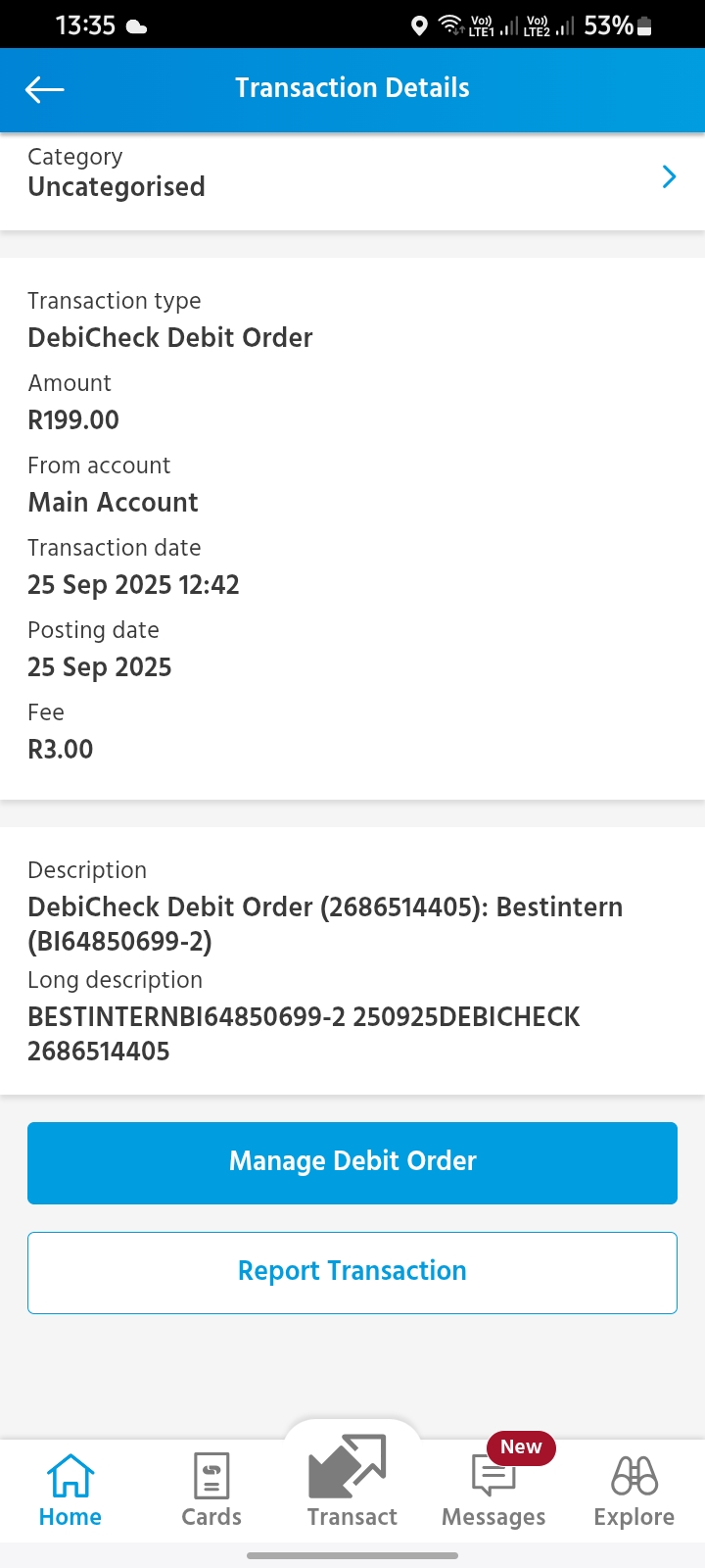 They took R199.00 from my account without the owner approval which is I. I don’t have any clue about this debit order I was just surprised to see money out in my bank I contacted capitec they said they won’t refund me hence I made the approval self.