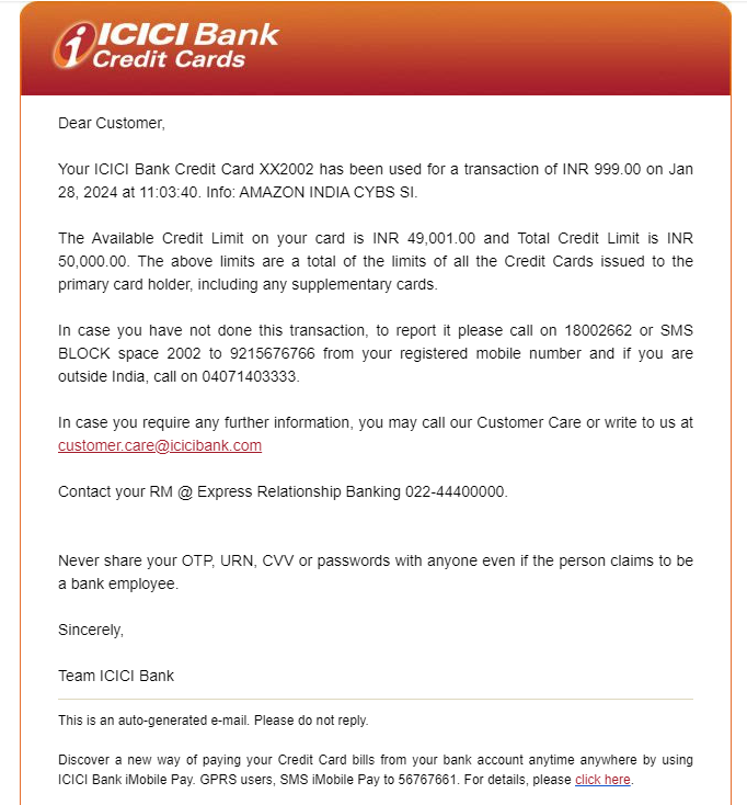 On 28th January 2024 I have got message of deduction of Rs 999 from my ICICI credit card to AMAZON INDIA CYBS SI without any info or OTP. This transaction has not been done by me at all and even there is no subscription for same.