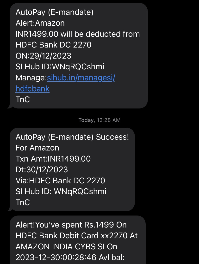 Amount of RS1499 was deducted from my Debit card by Amazon India CYBS SI on 30th December 2023 without any reason and without any Subscription and without any OTP or PIN . I first got a message on 27/12/23 saying Rs 1499 will be auto deducted from HDFC bank account on 30th December . I initially thought I hv made a transaction but that is not the case .