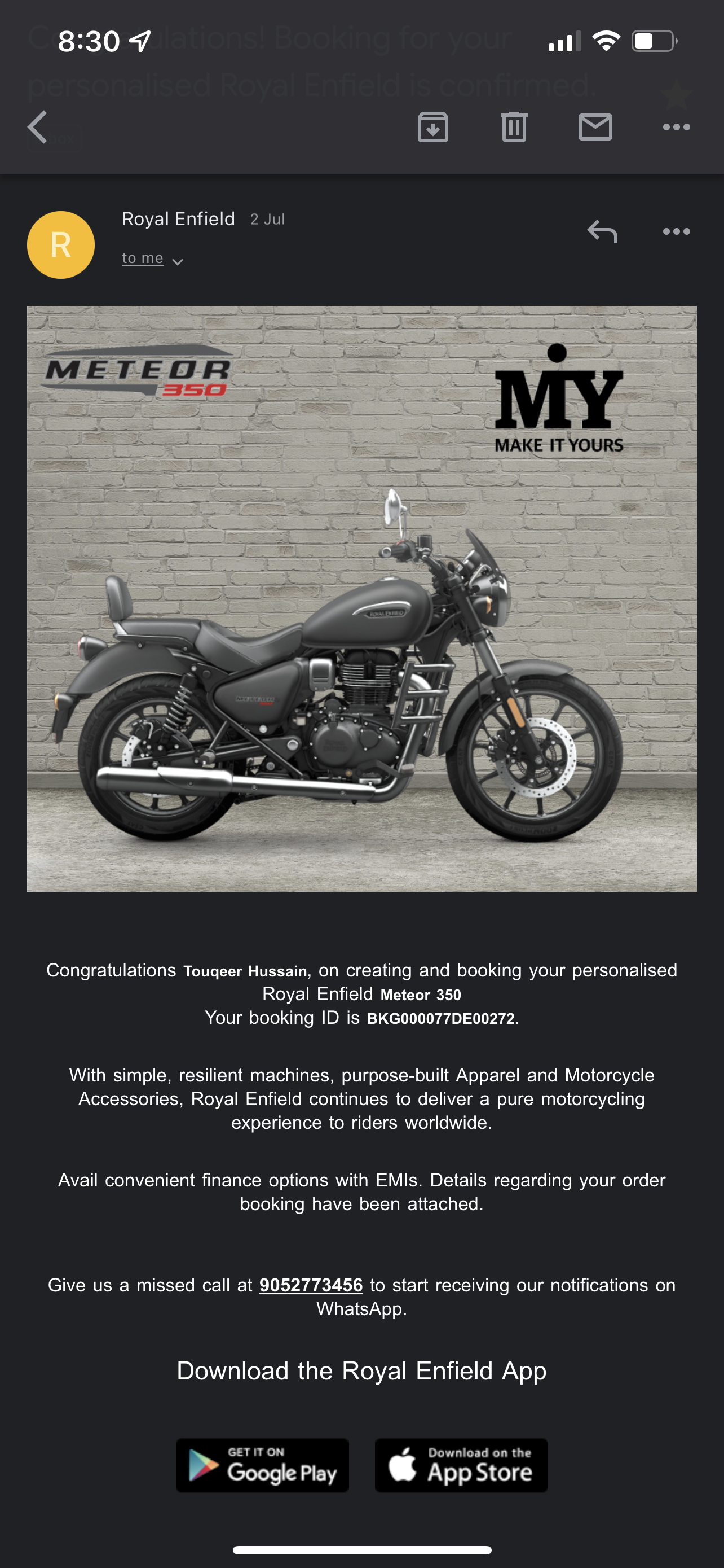 I booked a meteor 350 on 2nd july 2021 and since then i got no updates neither from the retailer nor from Royal Enfield support. Whenever i contact there support i get only one answer that “it will be delivered to you in 90 days”. There time period of 90 days is over now but still they are not delivering my motorcycle.