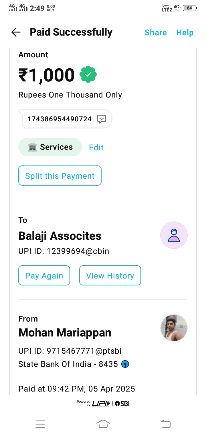 05.04.2025 date I was deosit amount of 1000 rupees pin up game I’d but not credit in amount . from mohan to balaji associates. But my account amount debited.