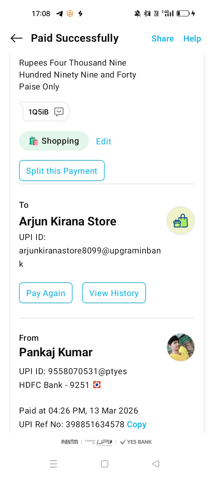 Amount 5000 date 13/03/2026 time 16:26:00 UPI ID 9558070531@pthdfc UTR 398851634578 richarge odar ID 7238650154139267128