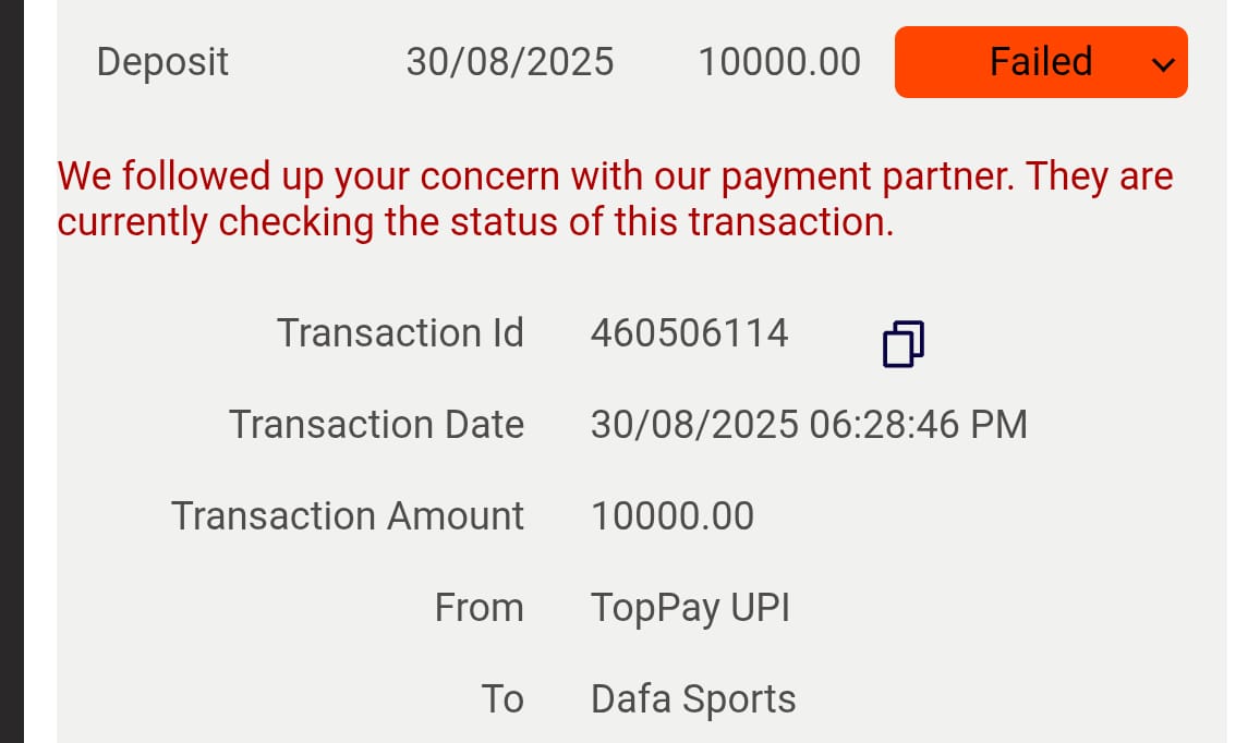 Hi iam akula reshma using dafabet.i deposited with 10000 rupees to dafa sports on30/08/2025. Still amount not added to my dafasports not refunded